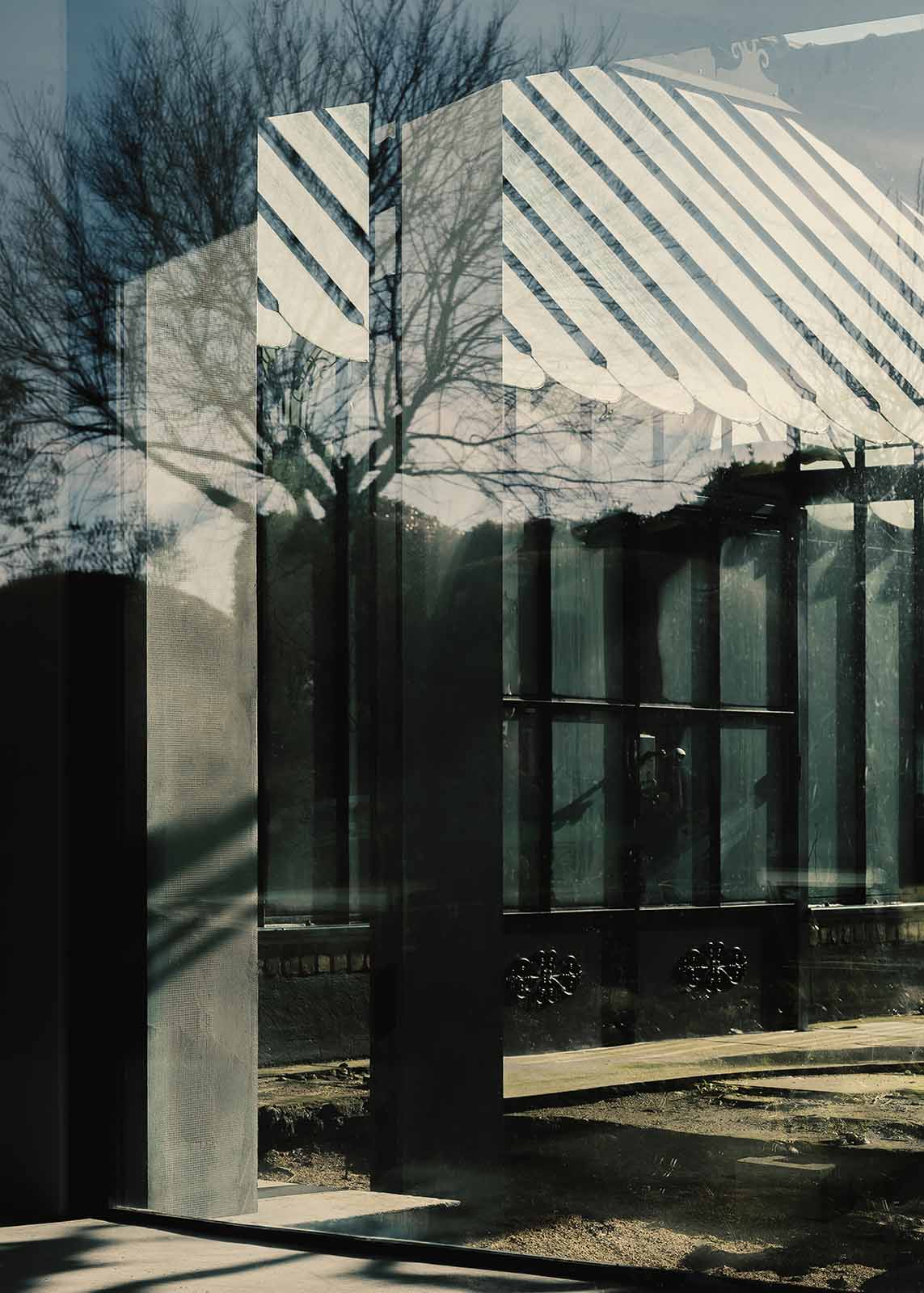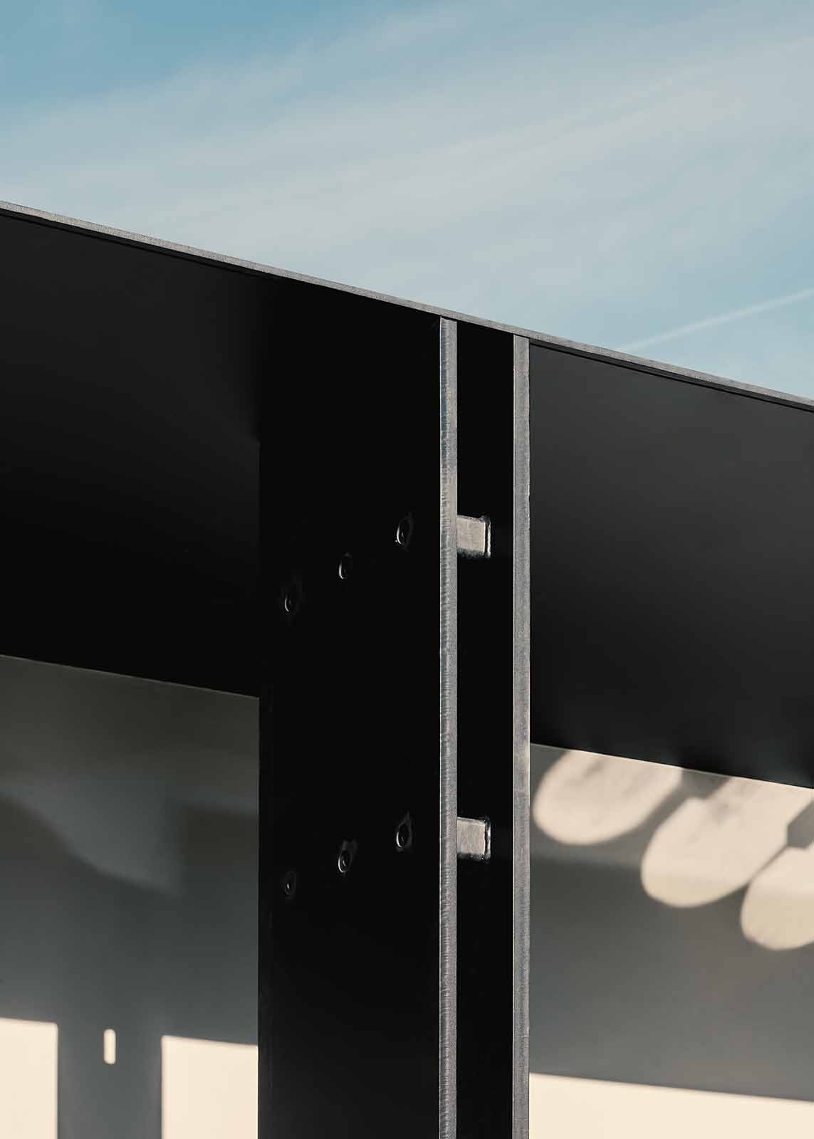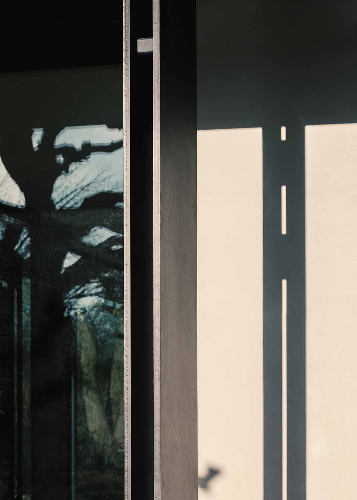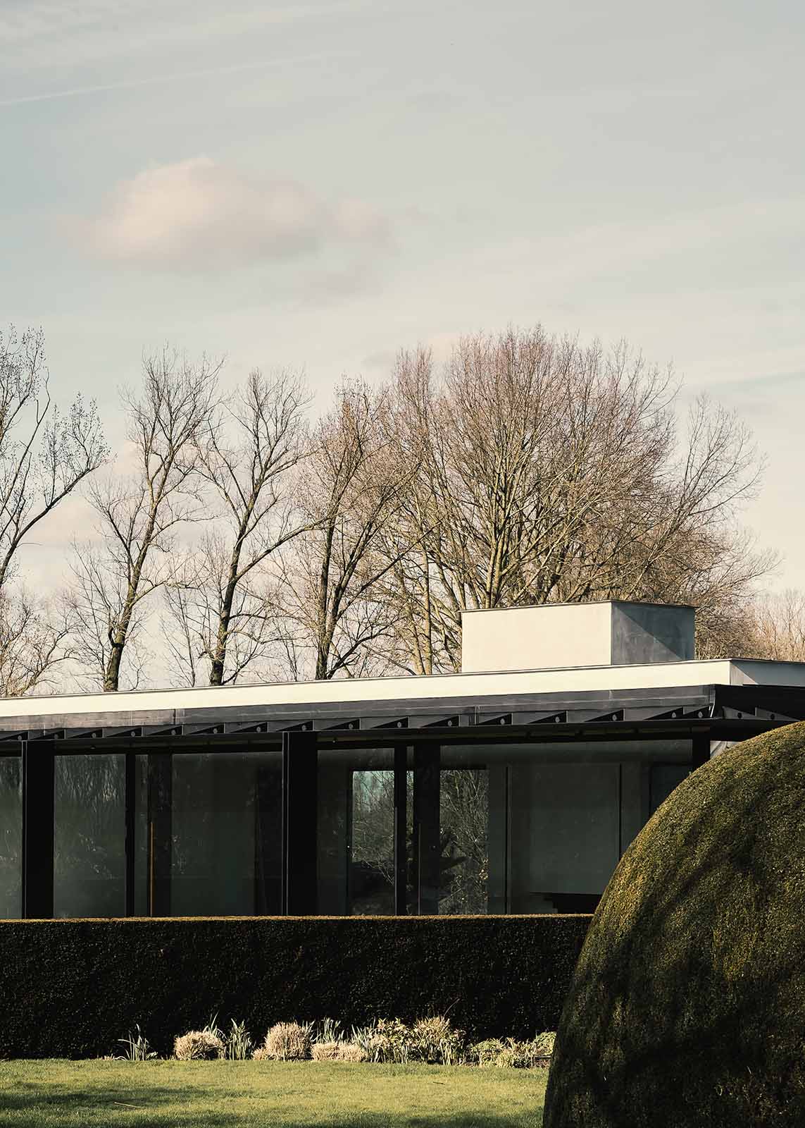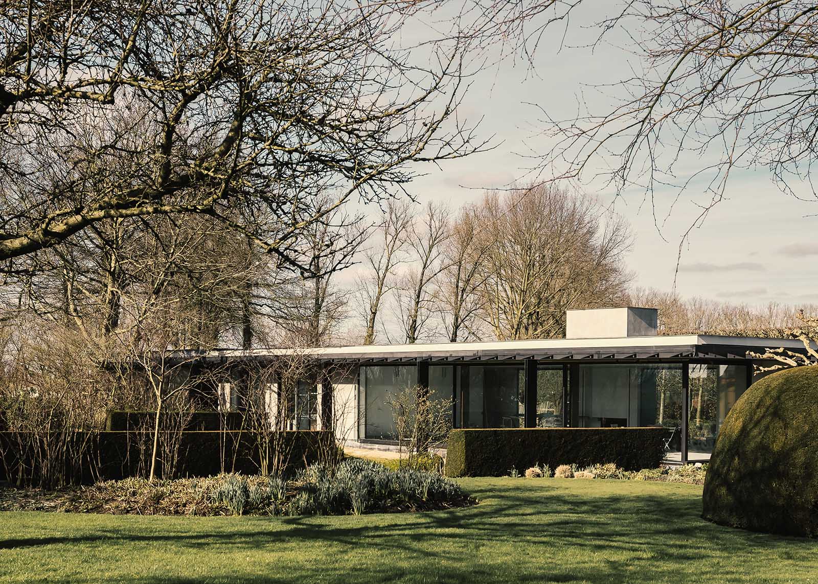 Deze lichtrijke guesthouse ligt uitgestrekt over het groene landschap en staat volop in verbinding met de natuur. Het samenspel van glas en dubbele stalen kolommen bepaalt de uitzonderlijke look van dit sobere volume. De natuurlijke sierpleister en de minimalistische profielen creëren een rustige aanblik. De achtergevel met brede luifels kan volledig geopend worden voor een maximale integratie met de buitenomgeving. De nieuwbouw vormt een knap contrast met de bestaande woning op het domein.