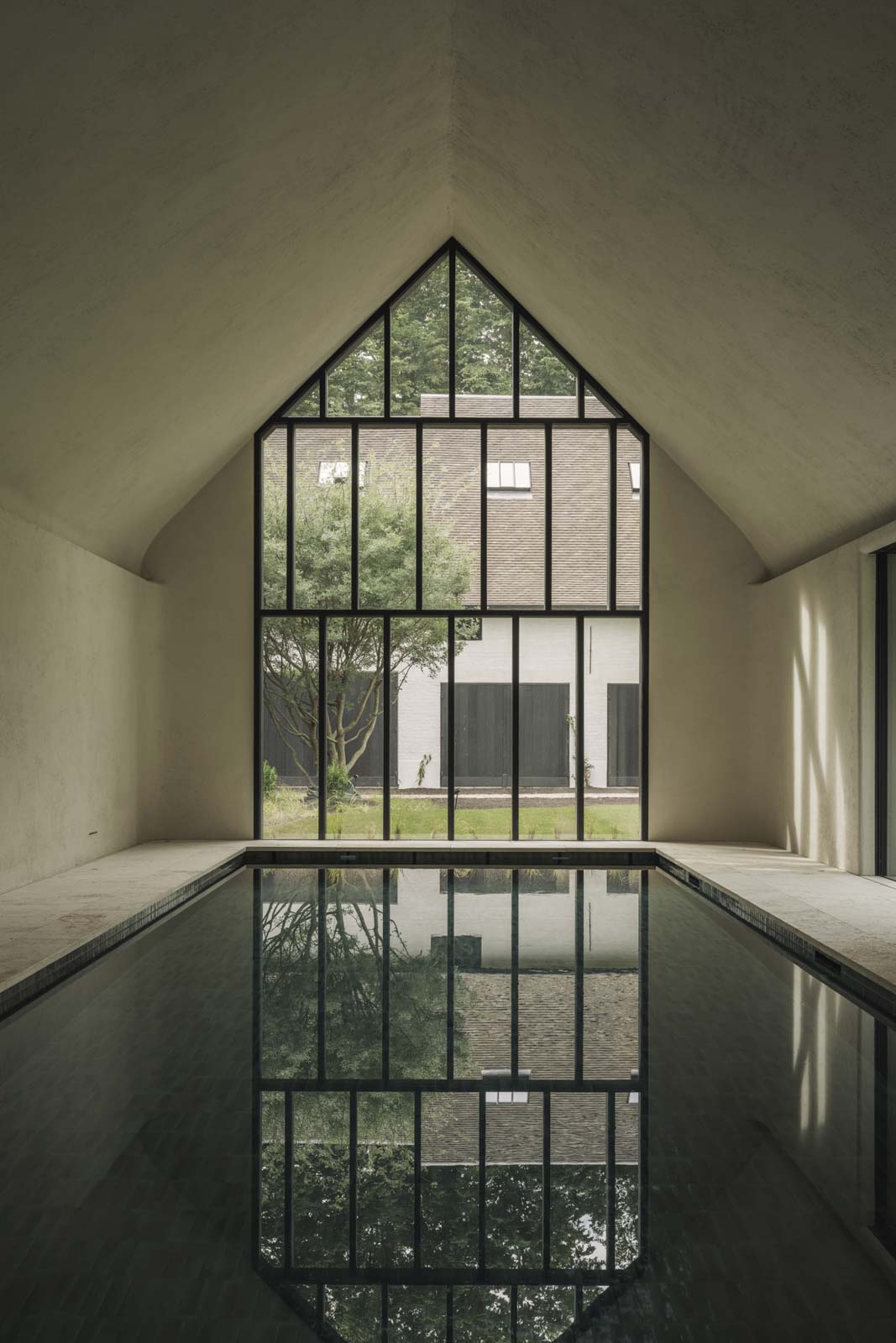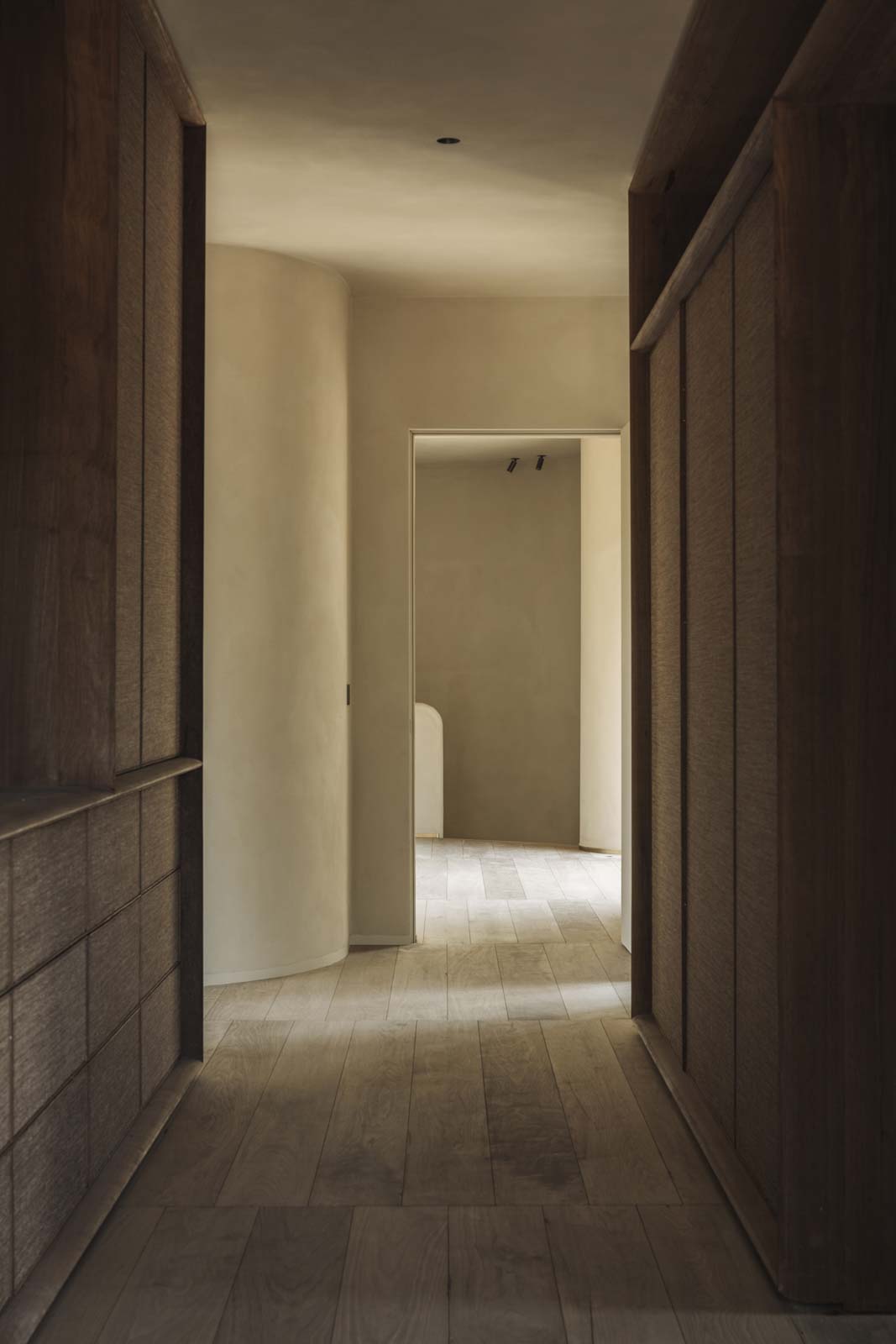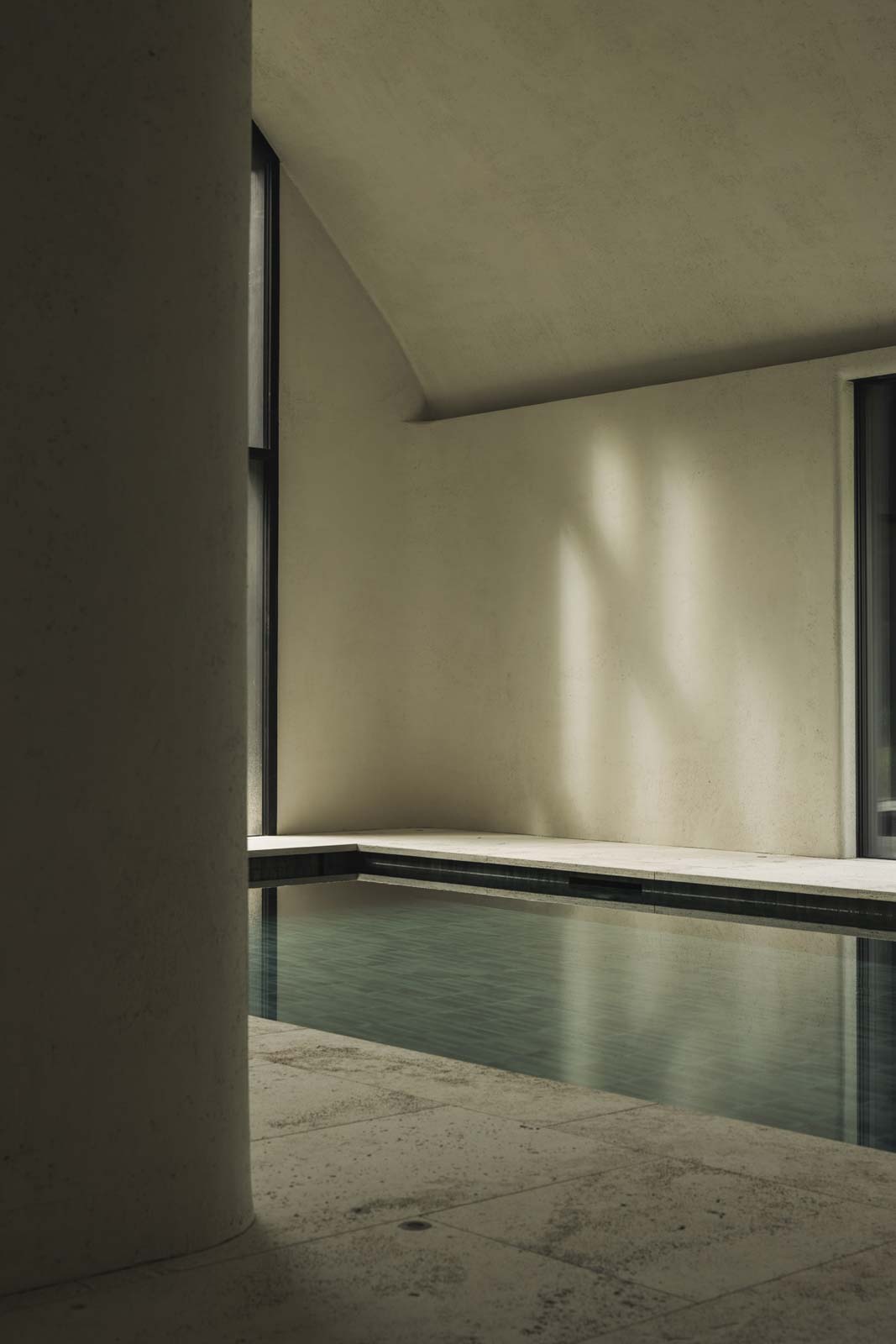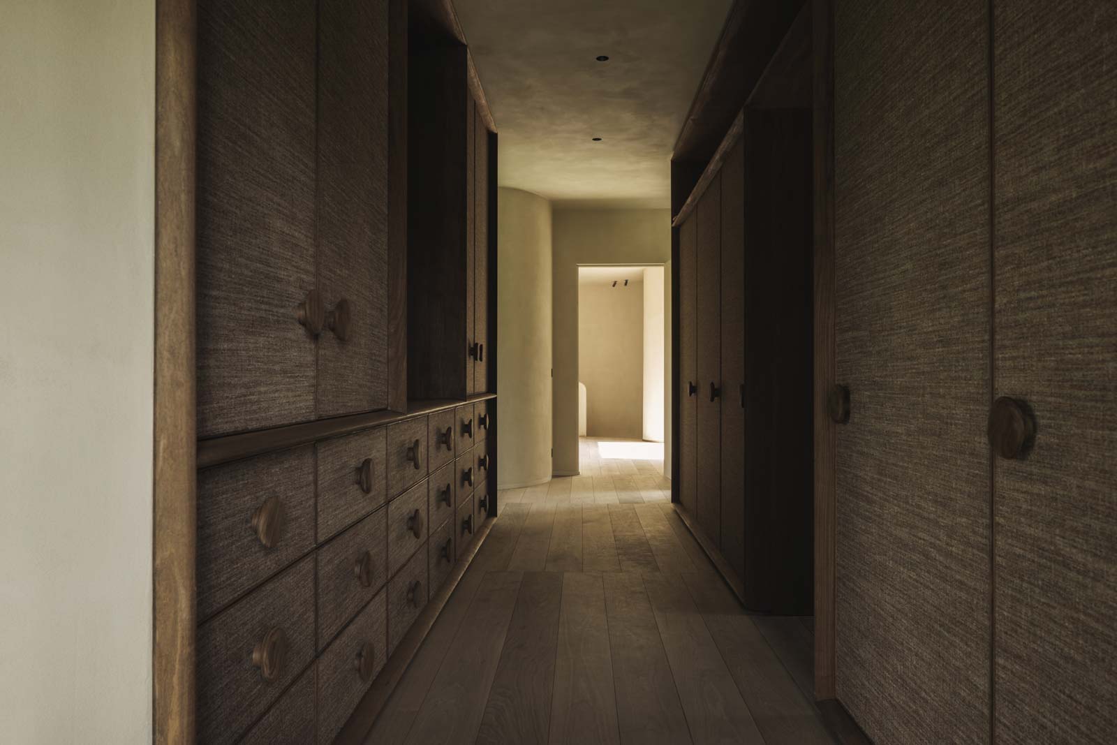 In de villa heerst een ontspannen sfeer en brengen de vloeiende lijnen en zachte vormen sereniteit in elke ruimte. Het interieur is uitgewerkt in een coherent kleurenpalet en met verfijnde details, zoals het notelaarparket.