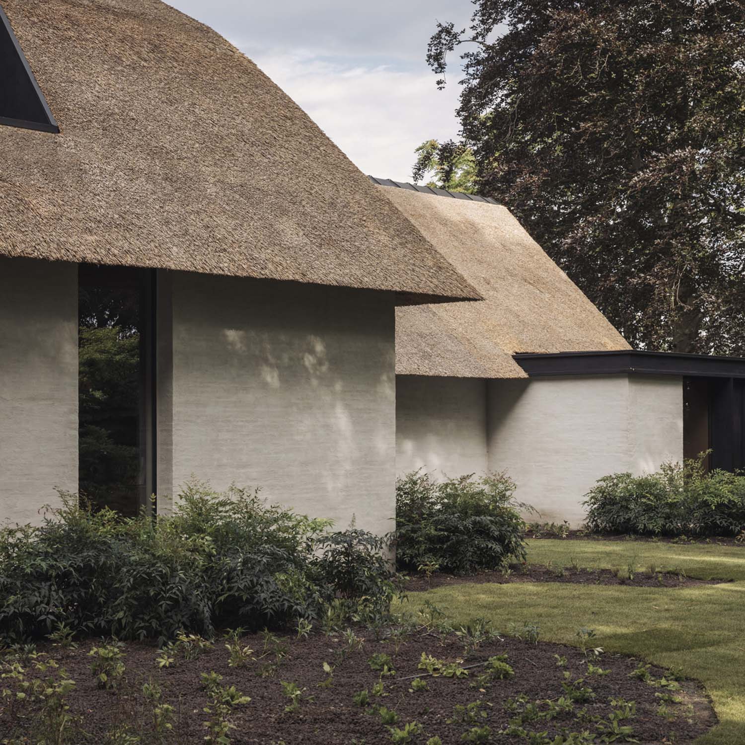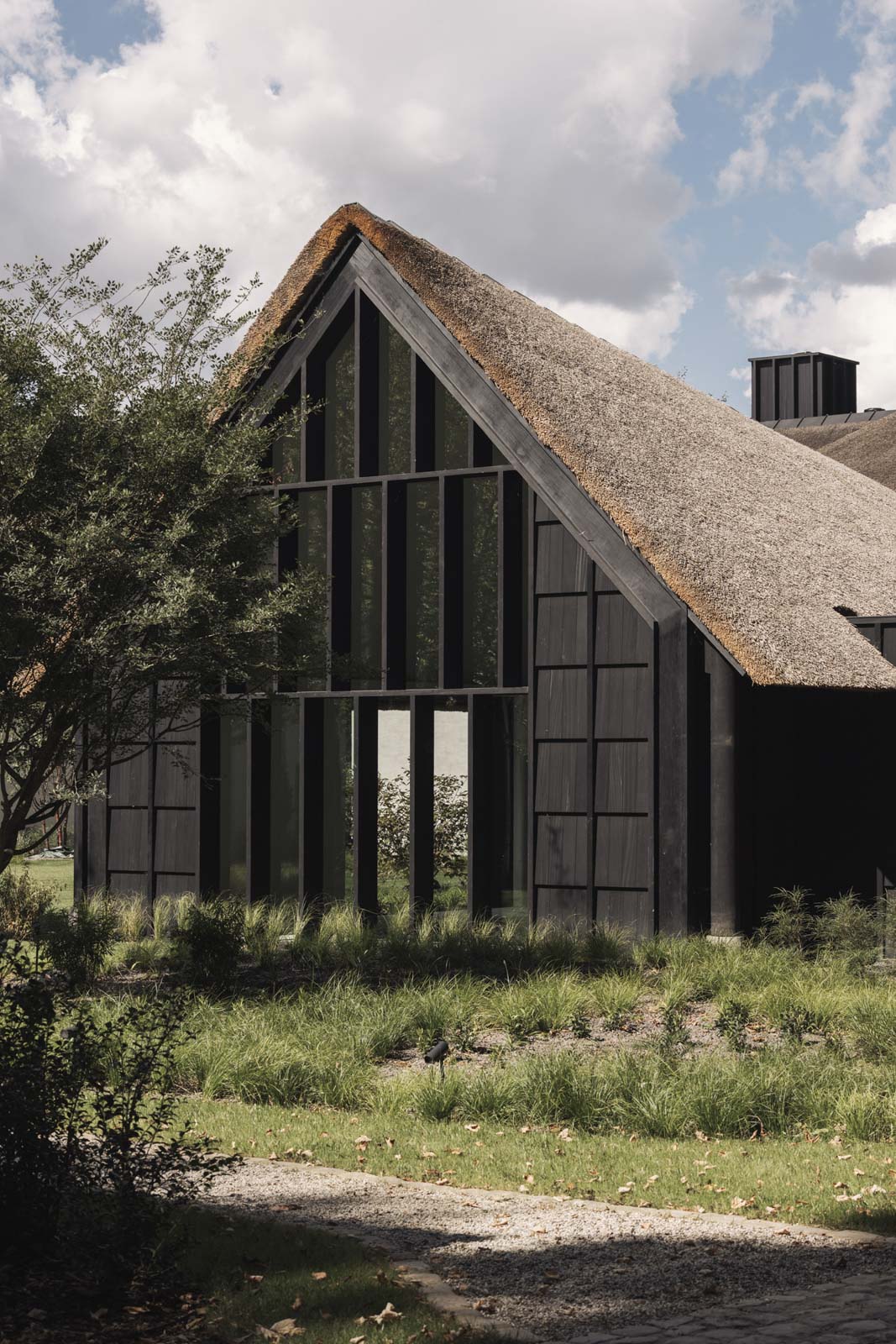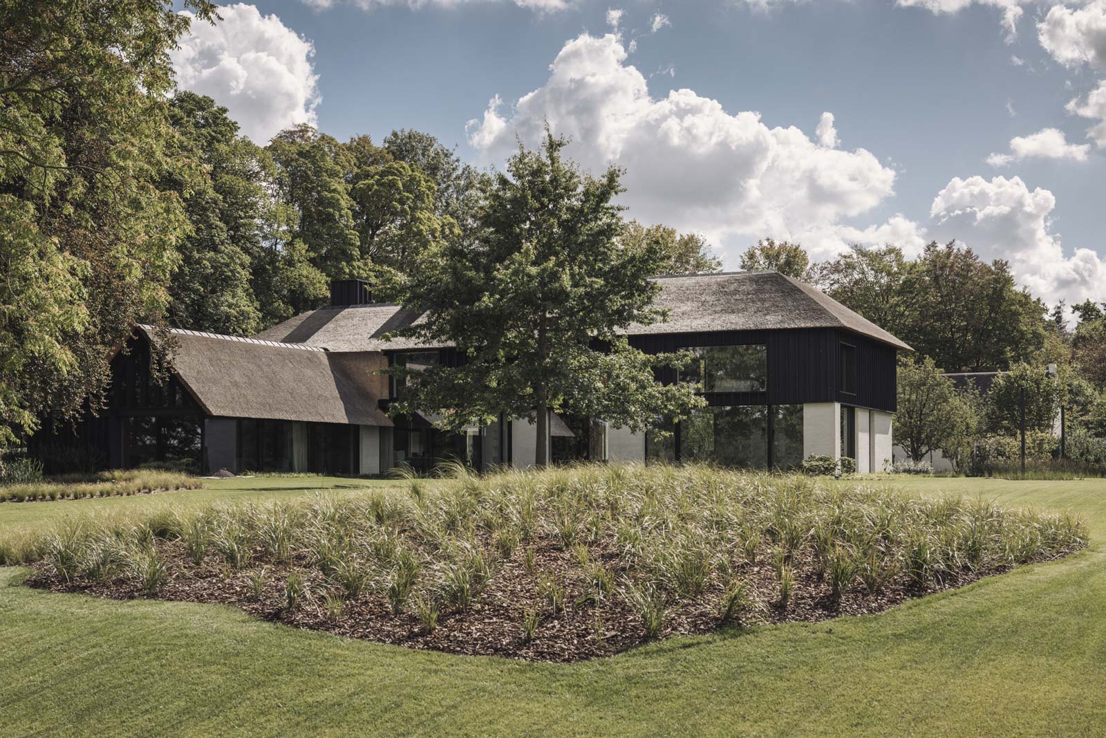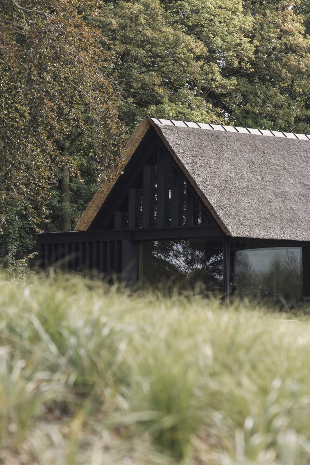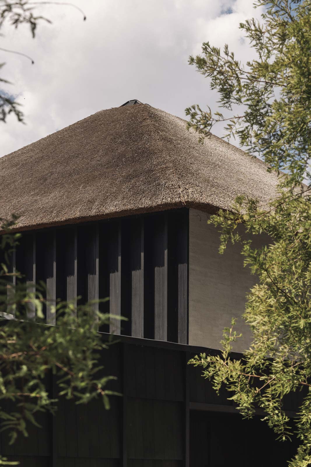 De hoofdwoning is afgewerkt met een thermisch gemodificeerde houten gevelbekleding, gekaleid metselwerk en een conische dakstructuur bedekt met riet. Zowel het exterieur als het interieur getuigen van uitzonderlijk vakmanschap. De monumentale volumes creëren een krachtig architecturaal statement.