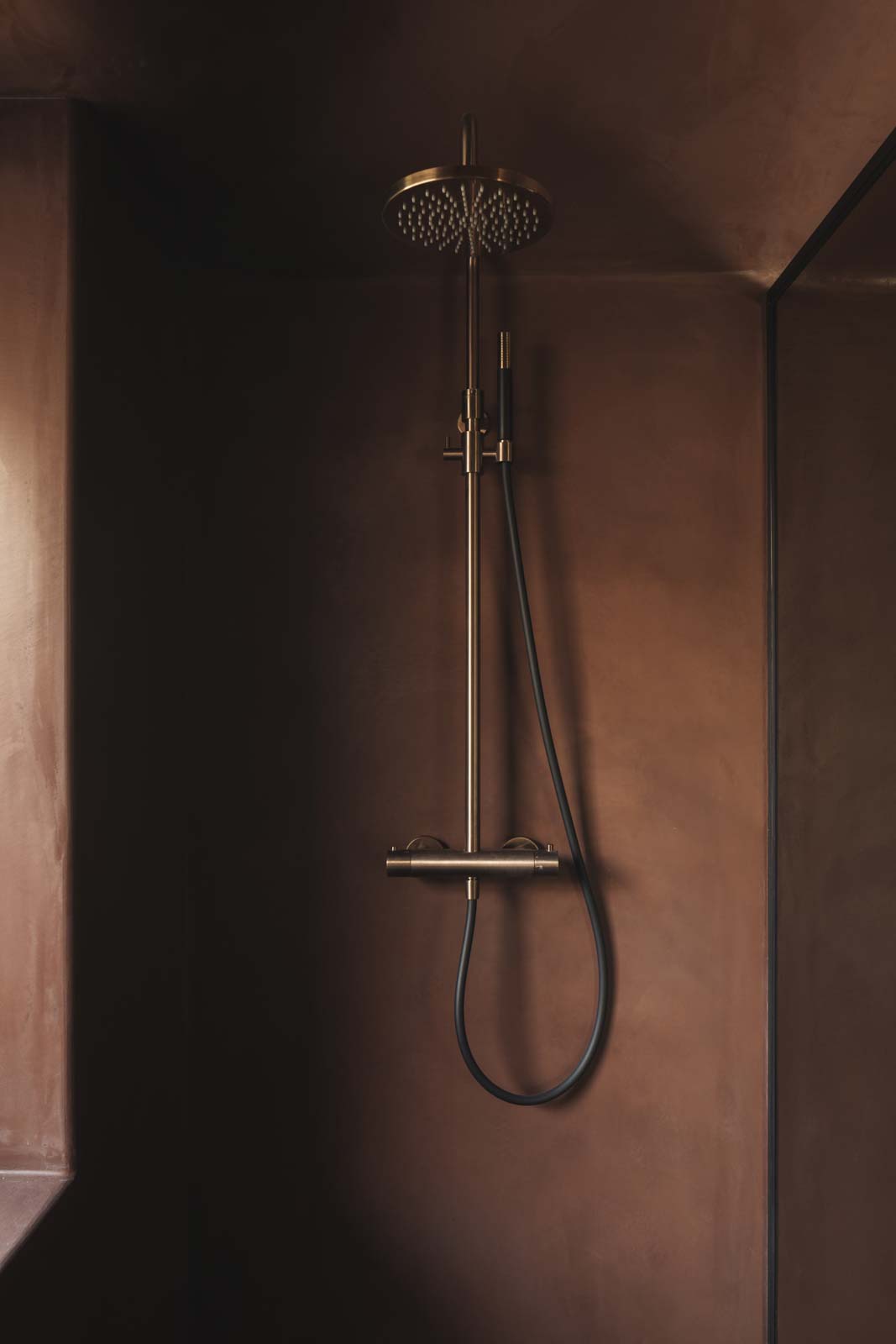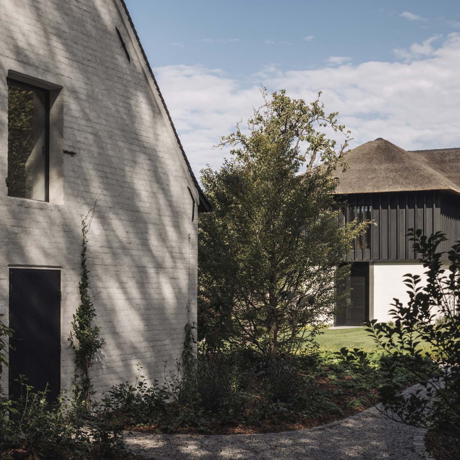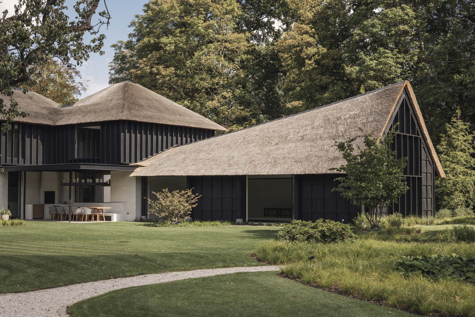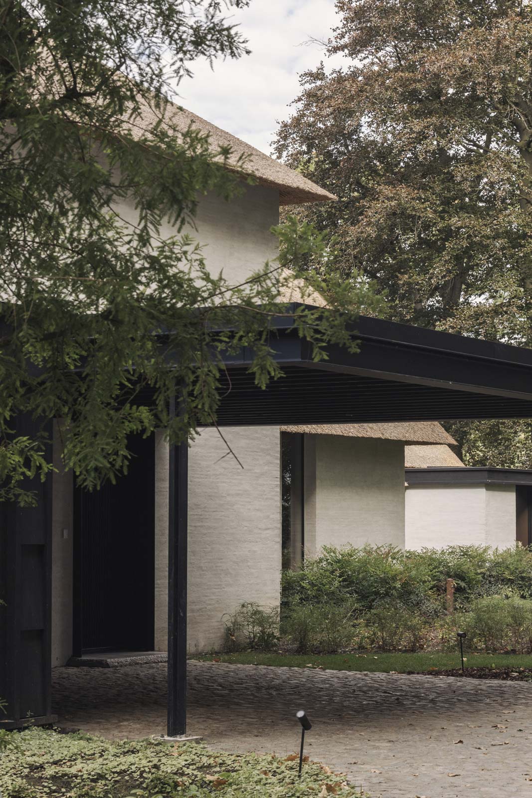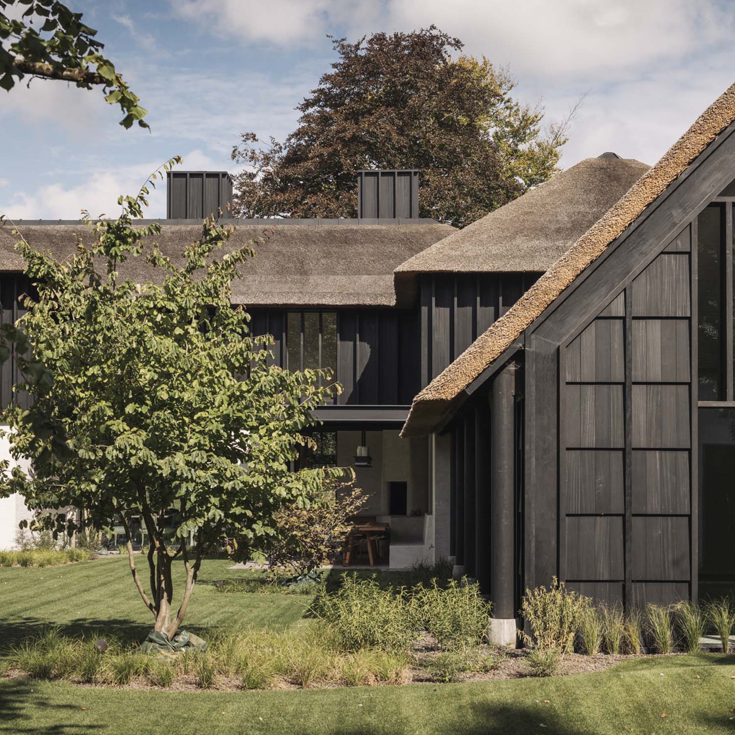 De hoofdwoning is afgewerkt met een thermisch gemodificeerde houten gevelbekleding, gekaleid metselwerk en een conische dakstructuur bedekt met riet. Zowel het exterieur als het interieur getuigen van uitzonderlijk vakmanschap. De monumentale volumes creëren een krachtig architecturaal statement.