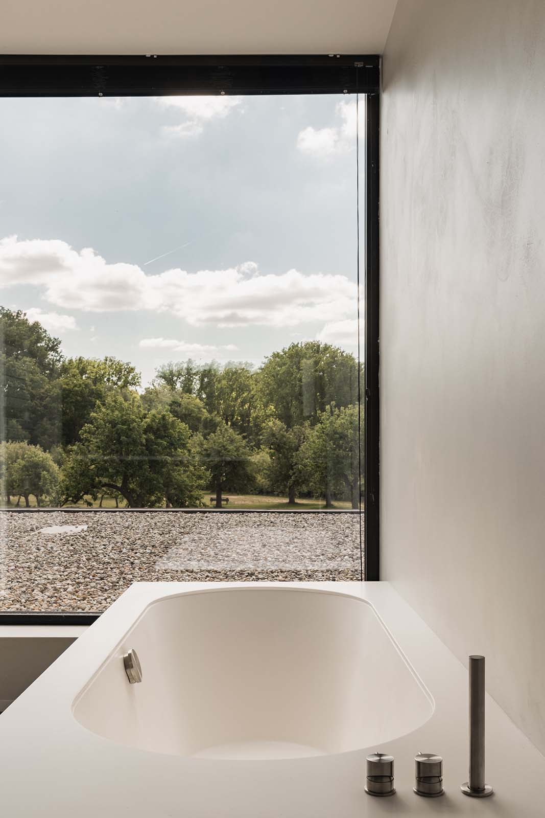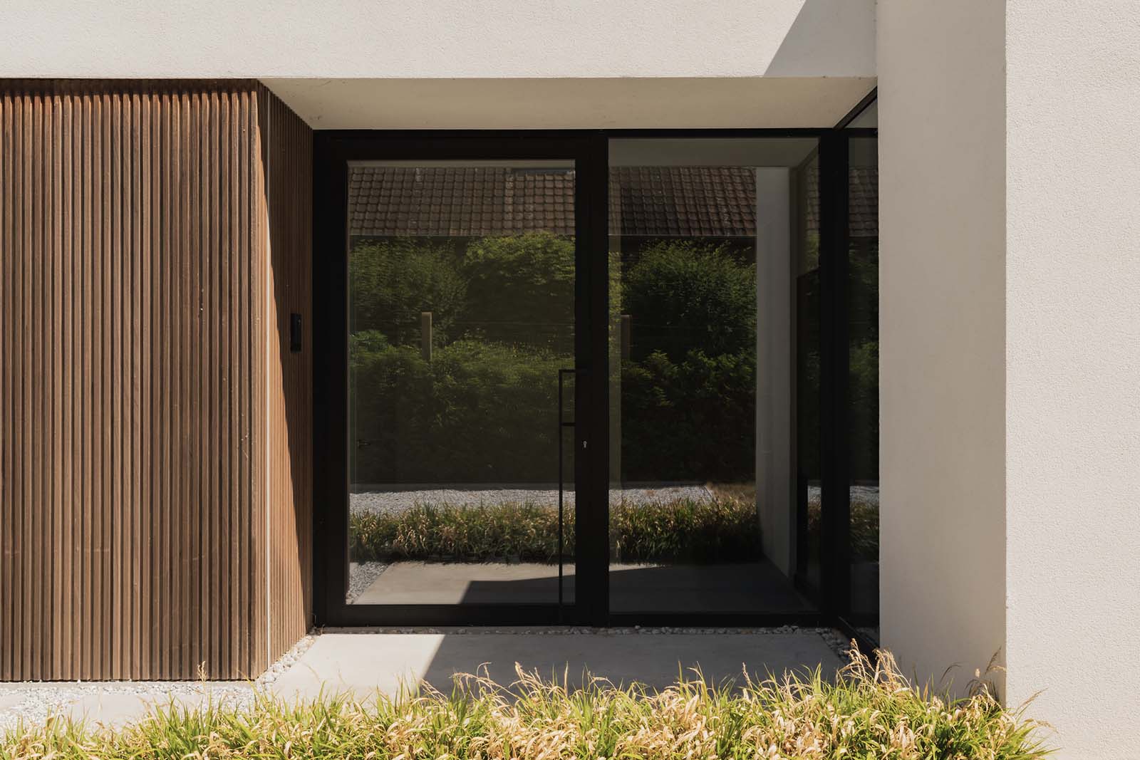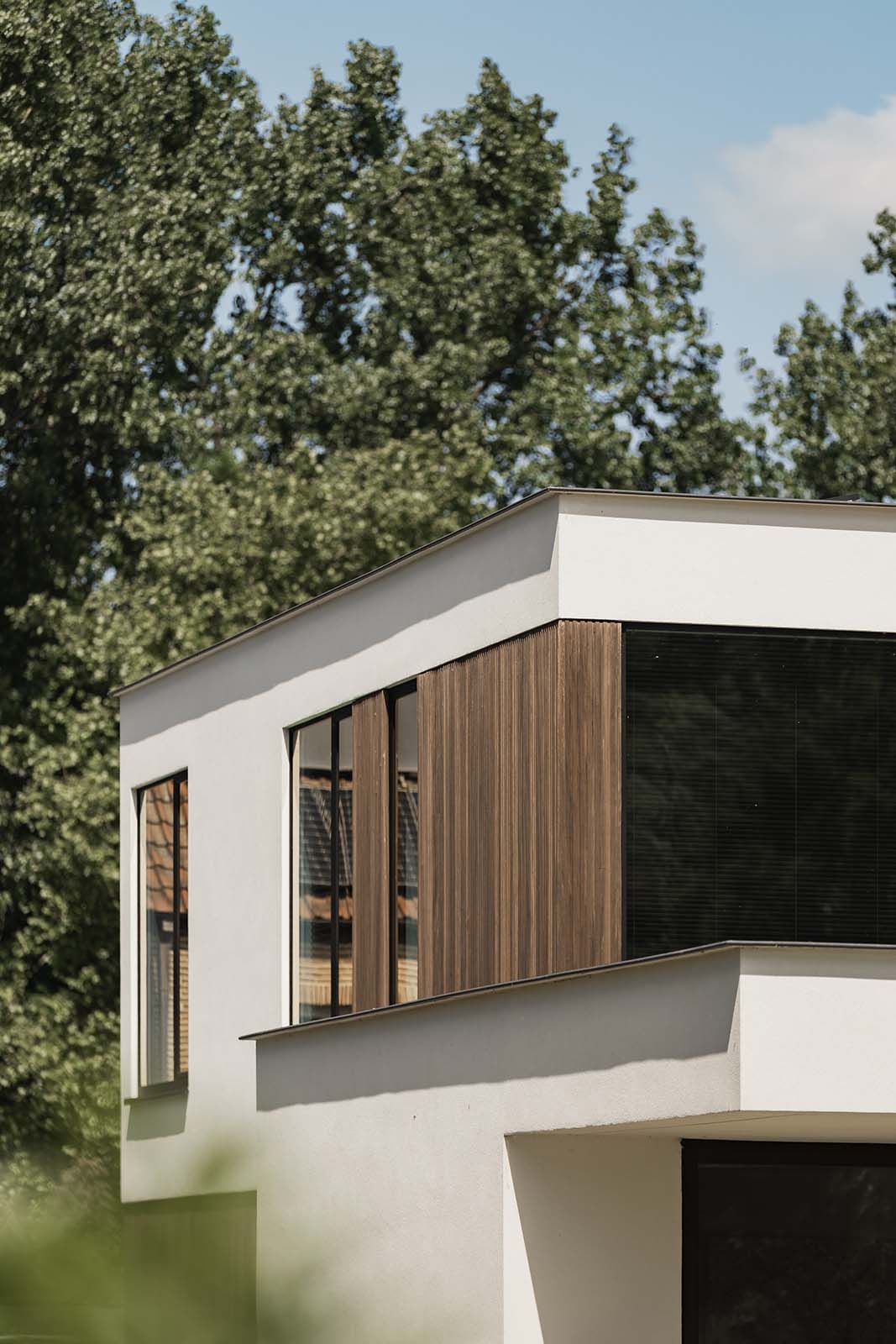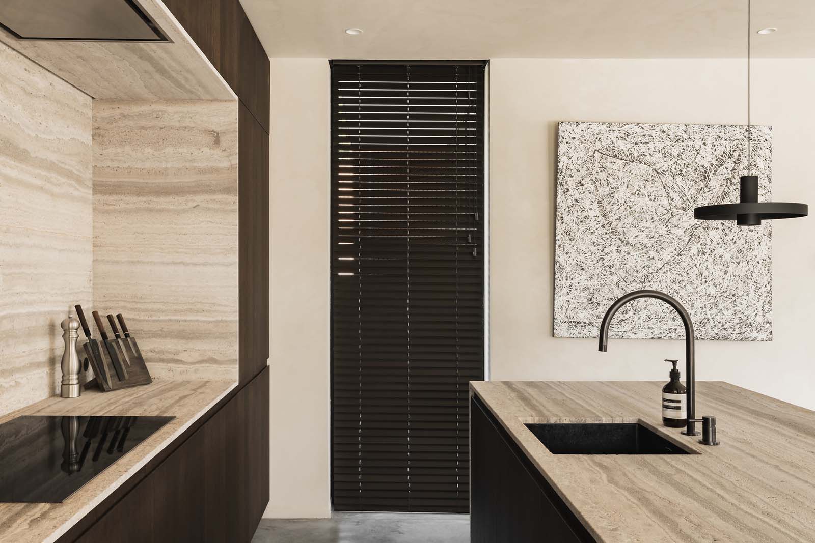 Achter deze strakke gevel met houten bekleding en zwarte accenten schuilt een groene oase van rust. Overal in de woning voel je de connectie met de natuur. De gepolierde betonvloer beneden draagt bij aan het authentieke karakter van de woning. Het parket boven vormt een verlengde van de houten trap. De eyecatcher is de keuken in diepbruin eikenfineer en verzoet, gezandstraald Travertino Titanium-marmer uitgevoerd door maatwerkspecialist NTER.