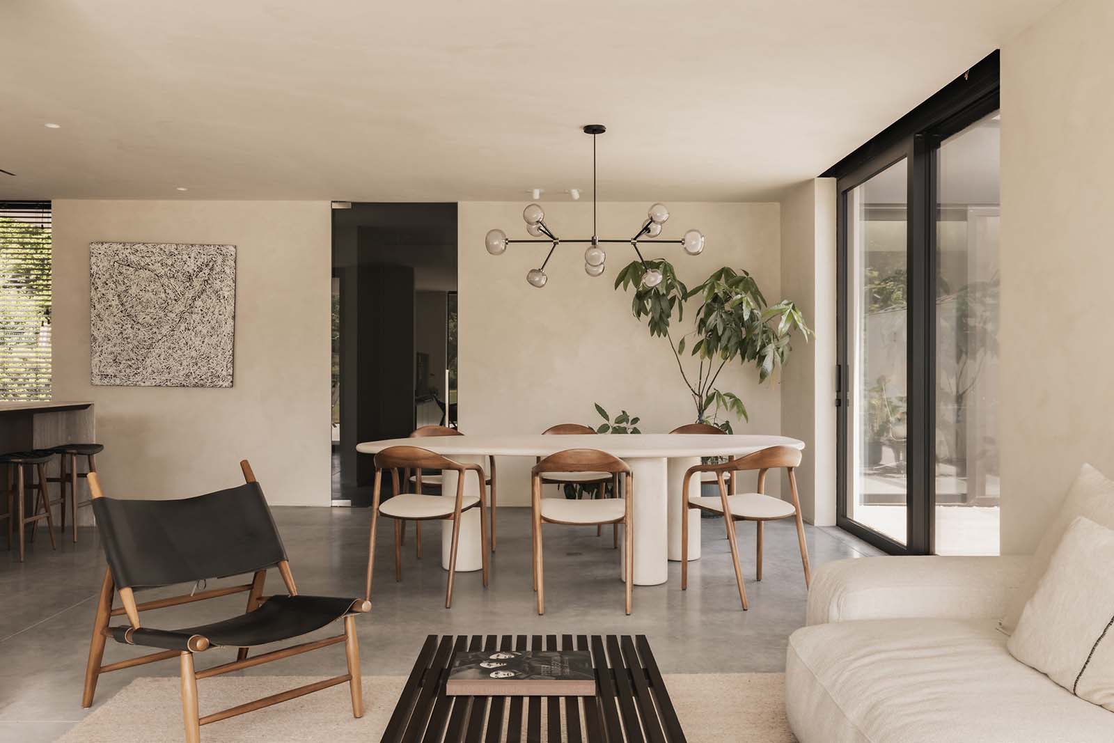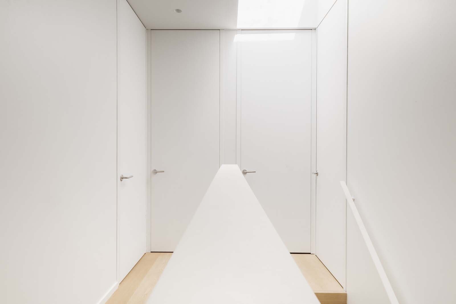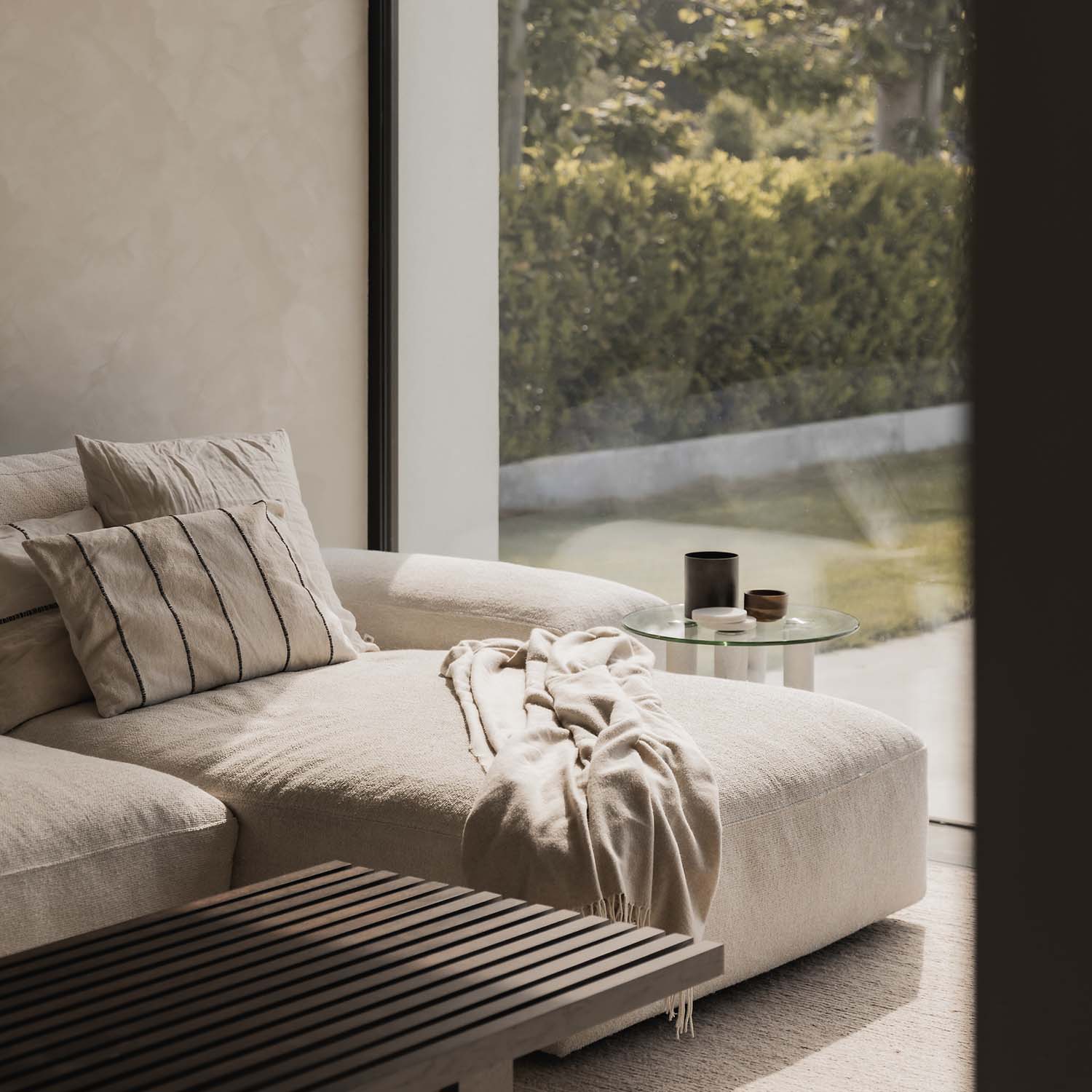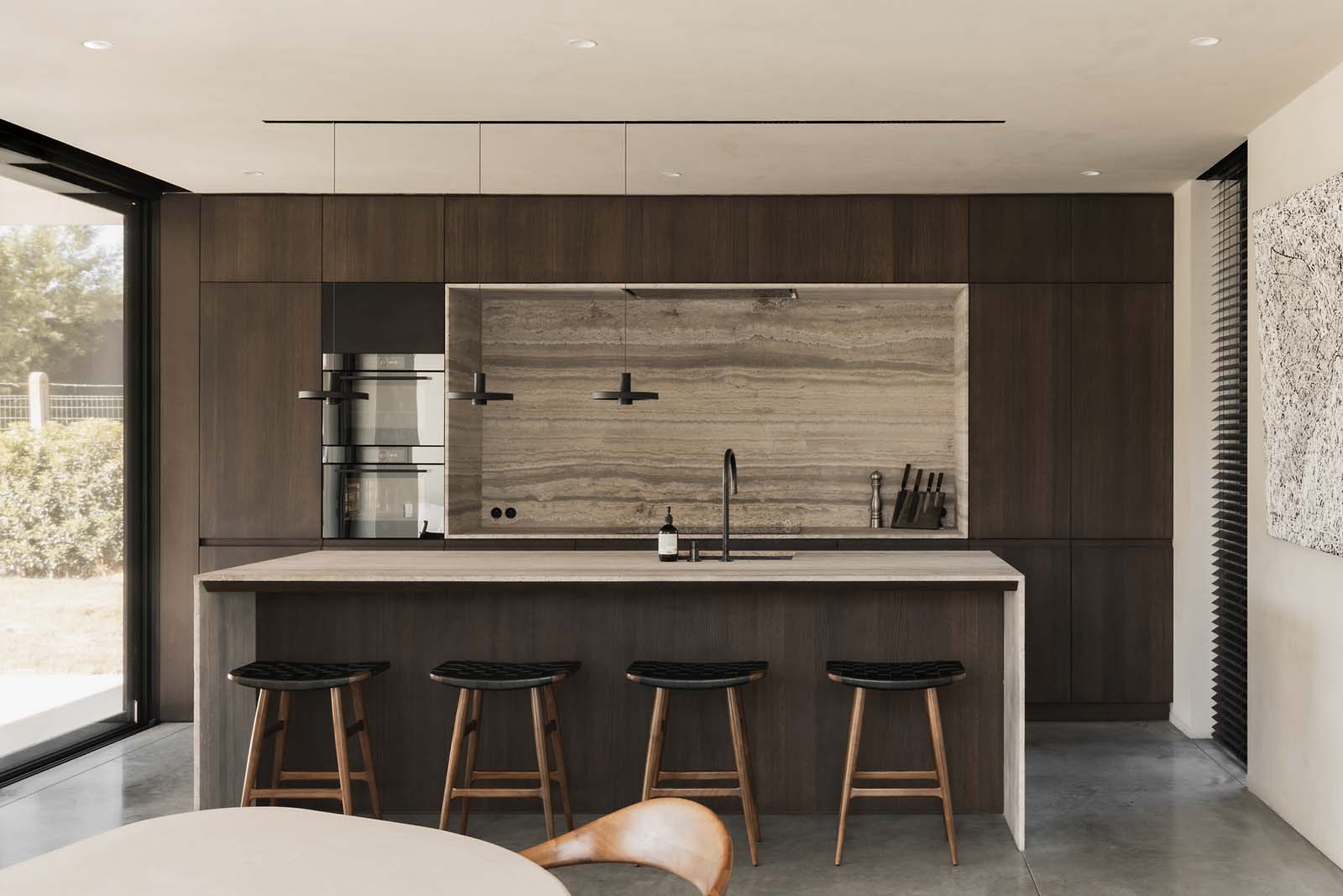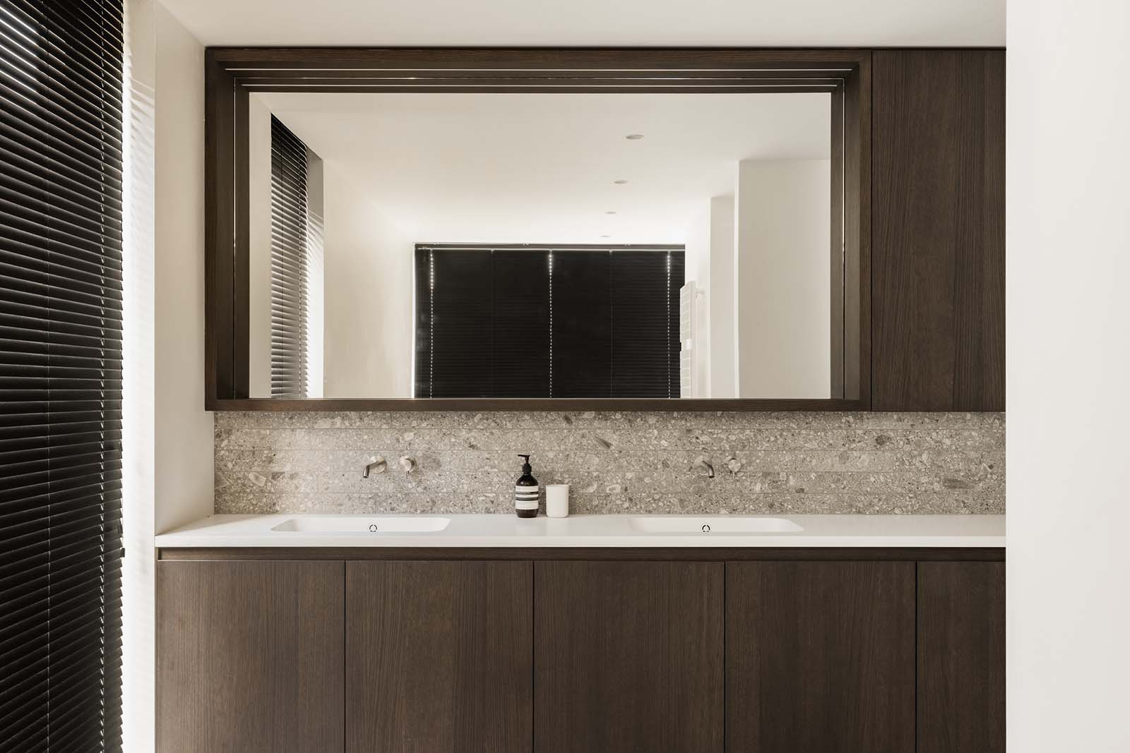 Achter deze strakke gevel met houten bekleding en zwarte accenten schuilt een groene oase van rust. Overal in de woning voel je de connectie met de natuur. De gepolierde betonvloer beneden draagt bij aan het authentieke karakter van de woning. Het parket boven vormt een verlengde van de houten trap. De eyecatcher is de keuken in diepbruin eikenfineer en verzoet, gezandstraald Travertino Titanium-marmer uitgevoerd door maatwerkspecialist NTER.