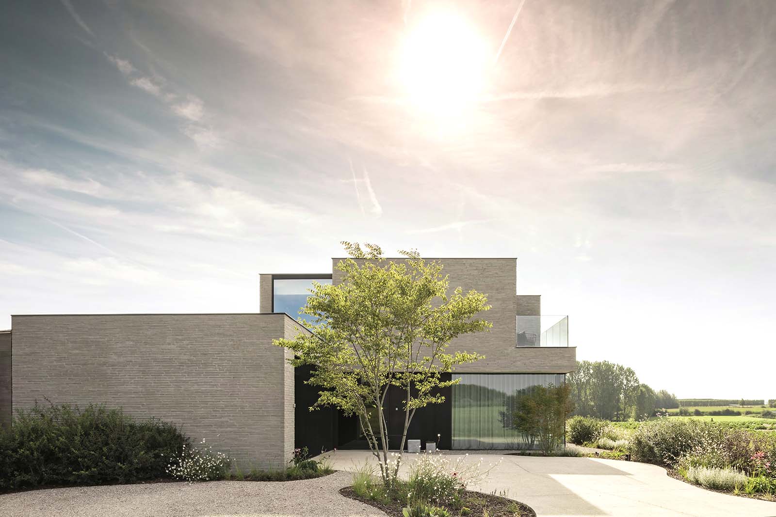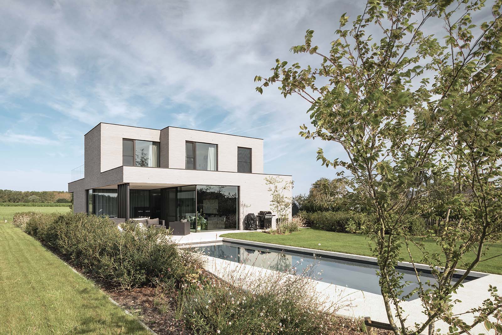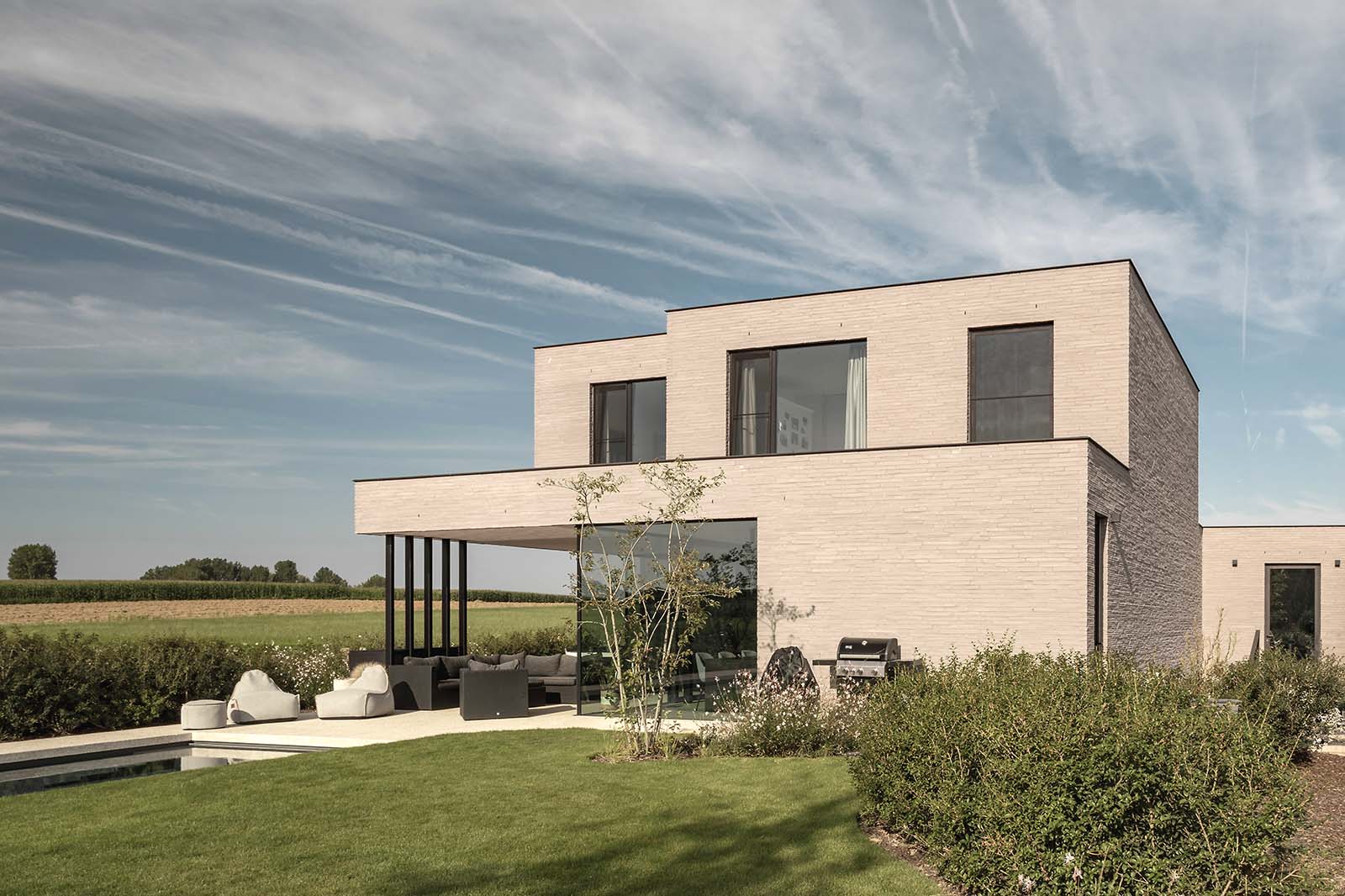Op een unieke locatie in het rustige Hillegem pronkt deze ruime villa met uitgepuurd vormenspel. De strakke architectuur komt tot zijn recht door de lichtgrijze keramische gevelsteen, grote ramen en zwarte aluminium accenten op de poort. Vanuit de living en eetruimte genieten de bewoners volop van het vergezicht over hun tuin en de velden.