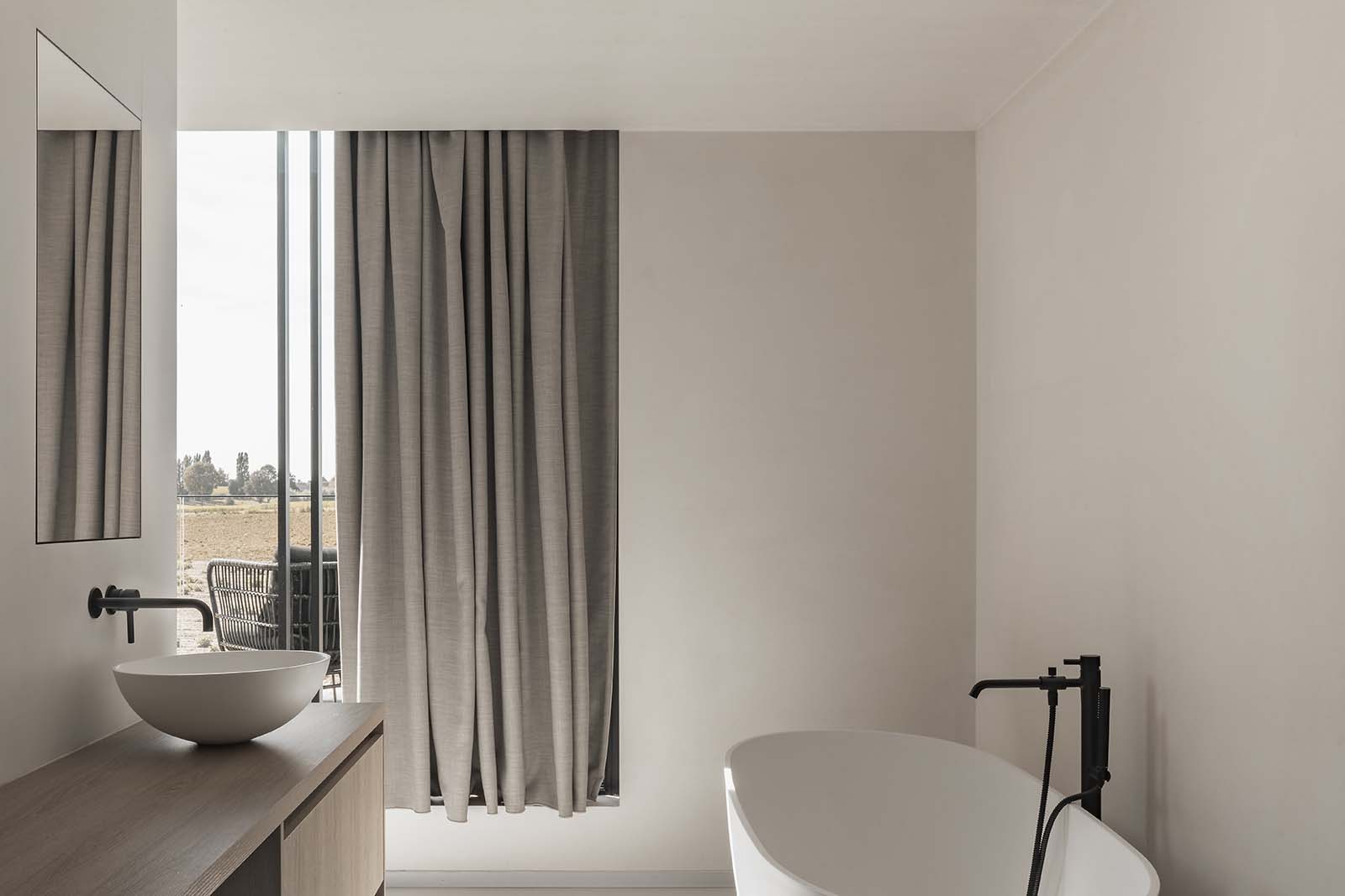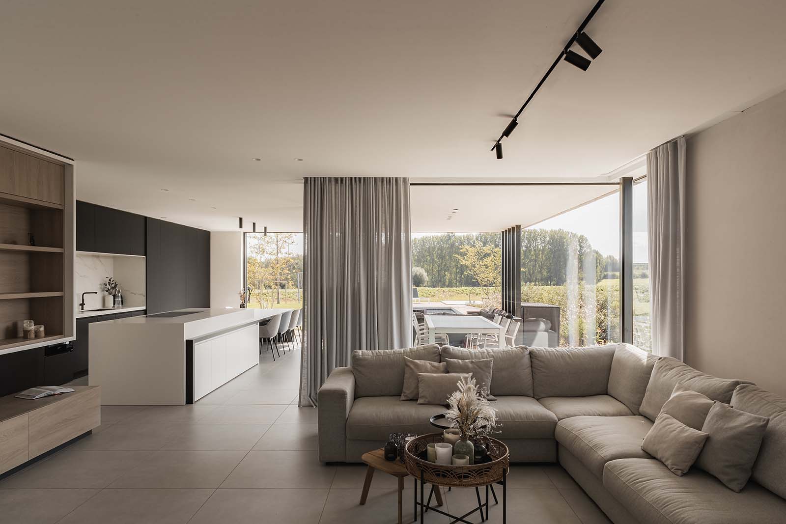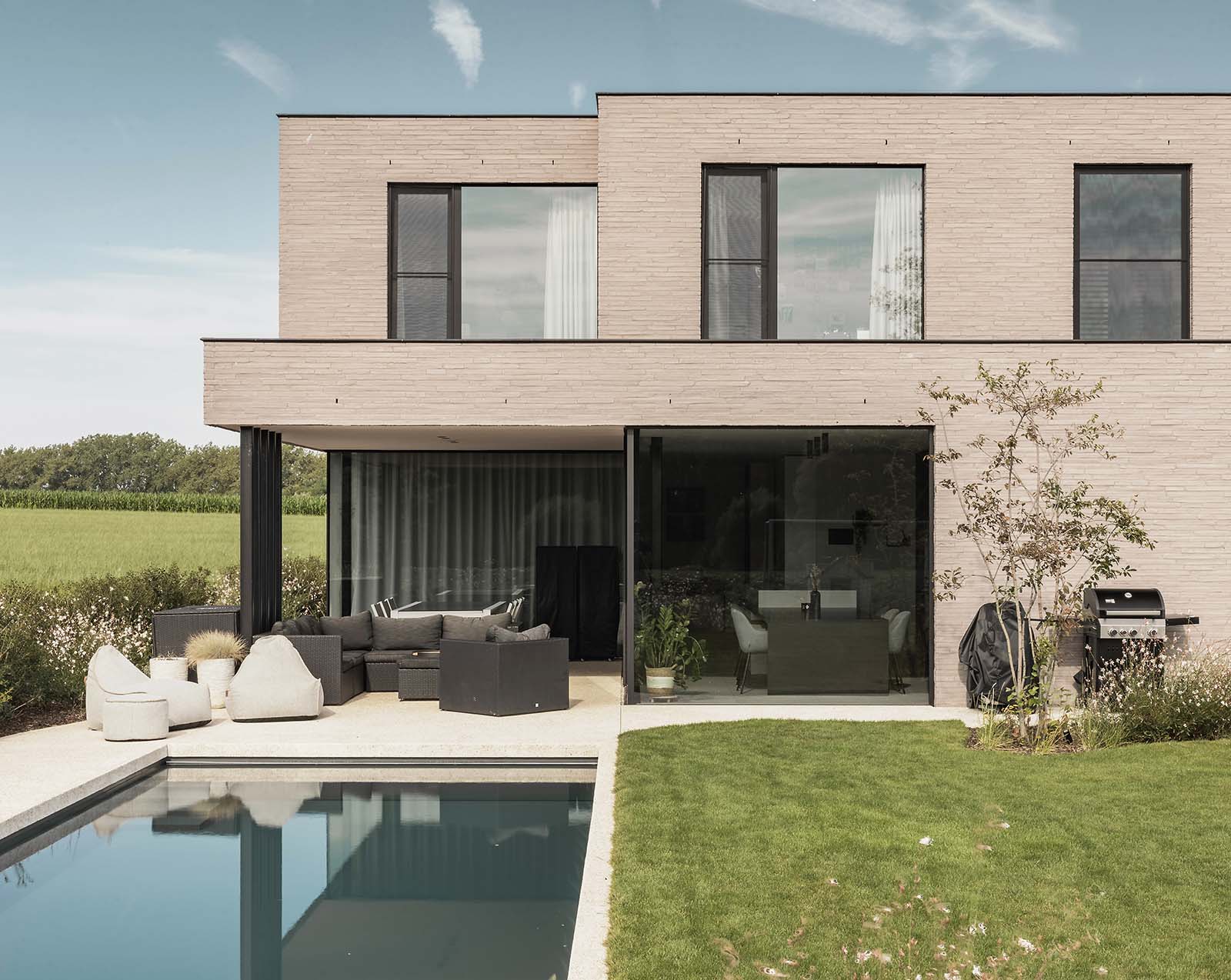 Op een unieke locatie in het rustige Hillegem pronkt deze ruime villa met uitgepuurd vormenspel. De strakke architectuur komt tot zijn recht door de lichtgrijze keramische gevelsteen, grote ramen en zwarte aluminium accenten op de poort. Vanuit de living en eetruimte genieten de bewoners volop van het vergezicht over hun tuin en de velden.
