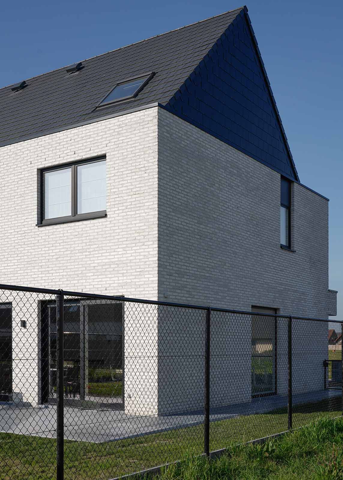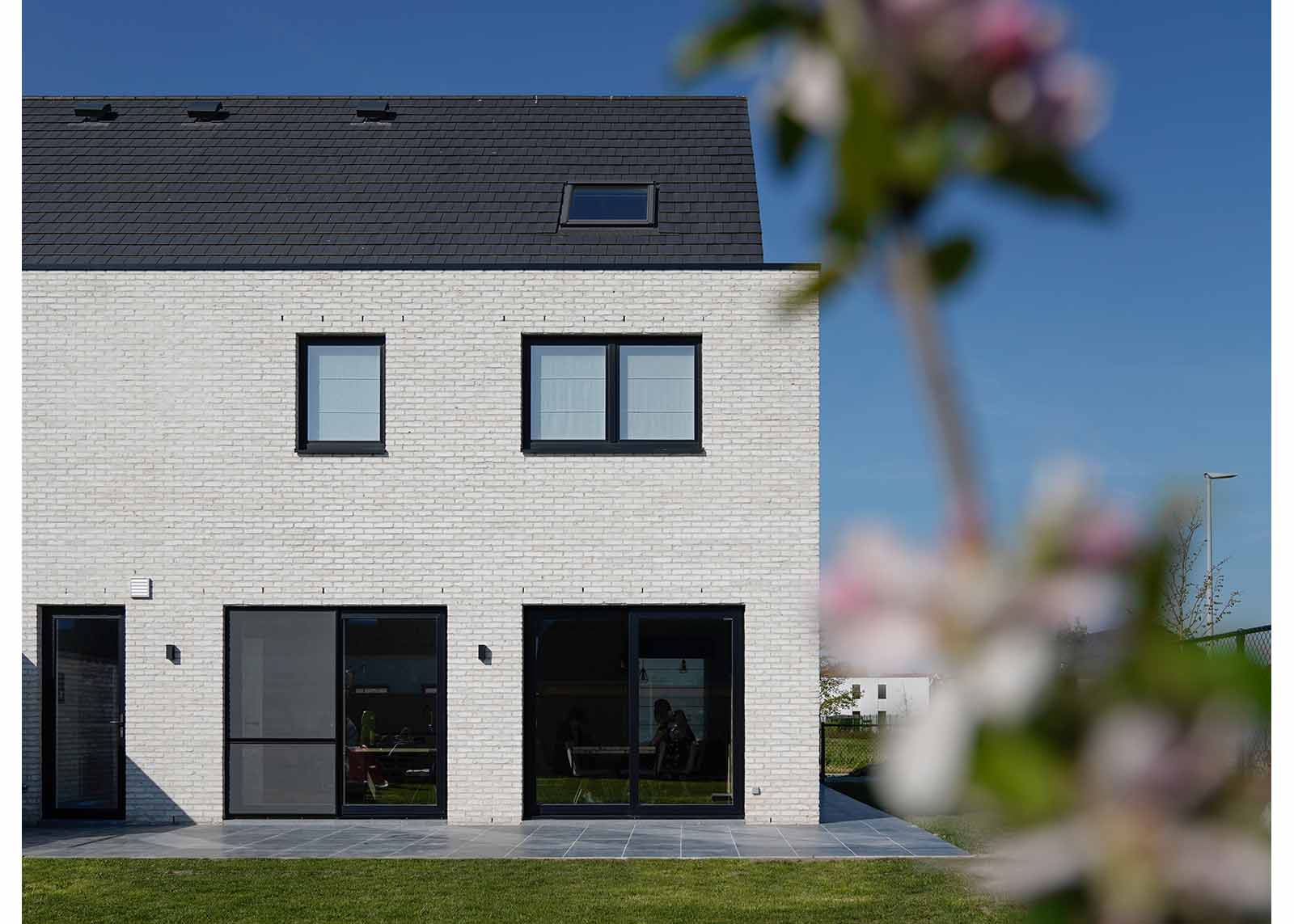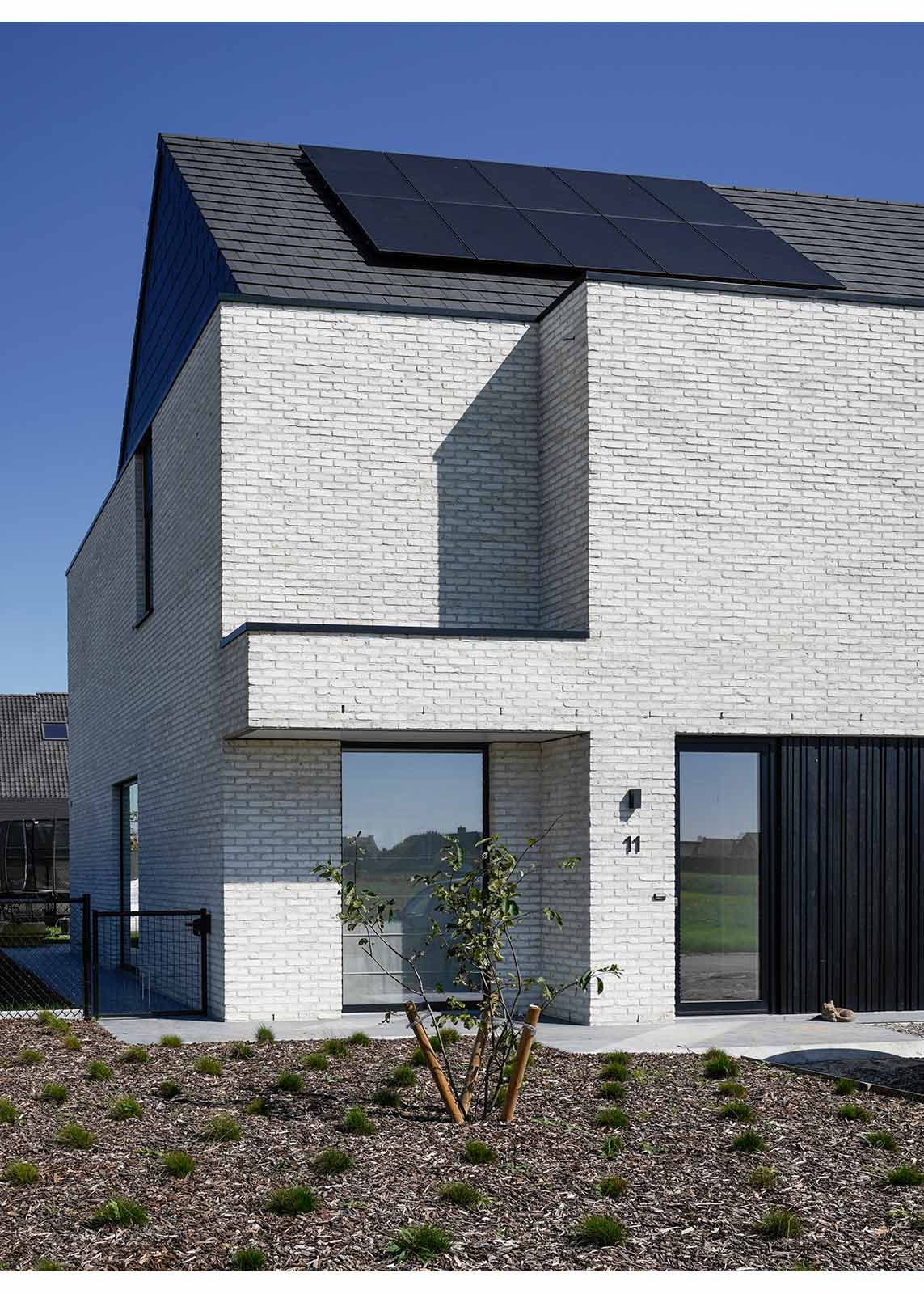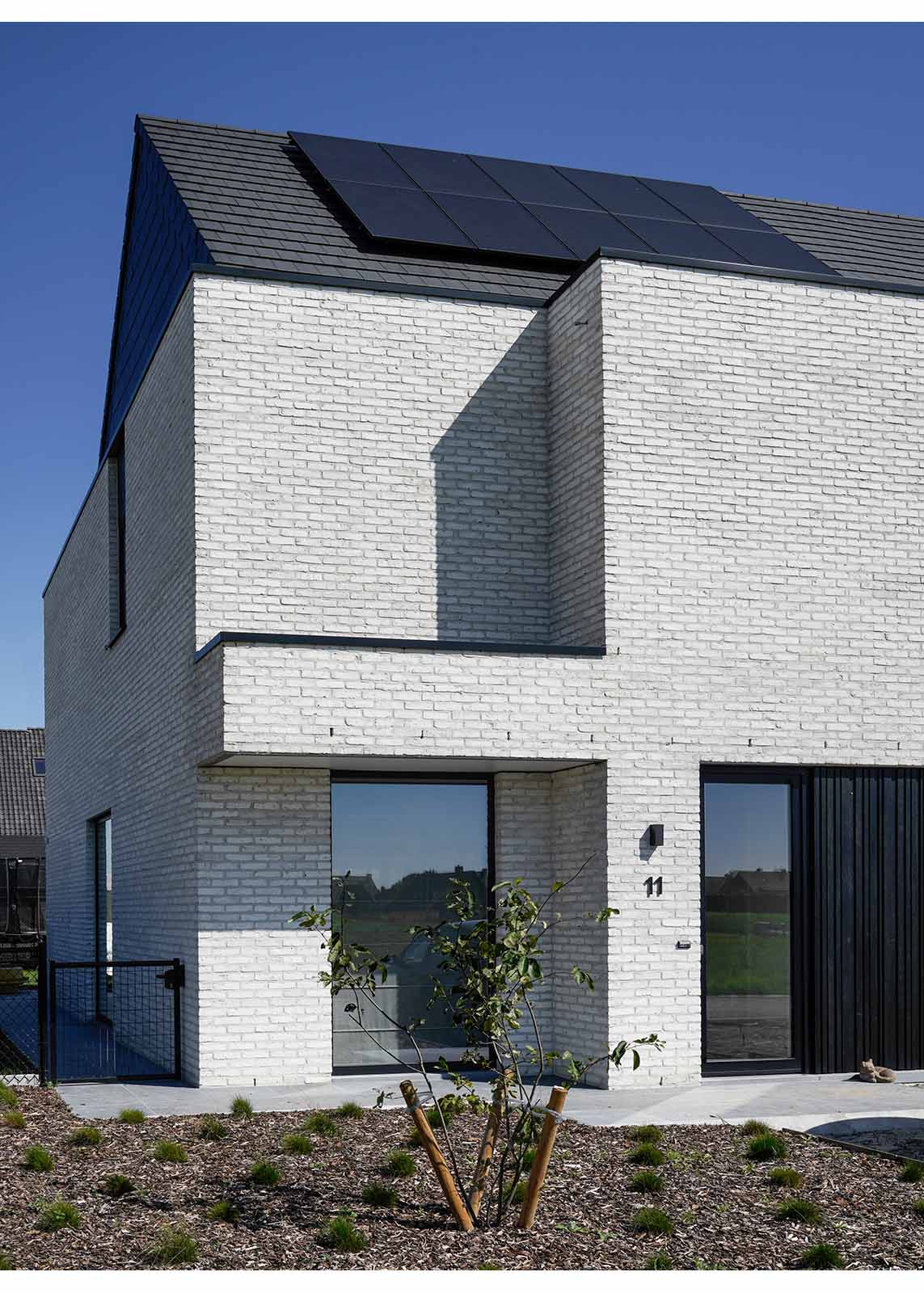 In deze moderne woning contrasteren de bleke gevelstenen knap met de zwarte houten accenten aan de poort en voordeur. Grote ramen garanderen een optimale lichtinval doorheen het hele huis. In de woning koos de familie S.-R. voor grijze vloertegels op het gelijkvloers, in de toiletten en in de badkamer. De vloer op het eerste verdiep is bekleed met laminaat. De open leefruimte met aanpalende keuken creëert een groot ruimtegevoel op de benedenverdieping. Met een oostelijk georiënteerde tuin geniet de familie het hele jaar door van een aangenaam binnenklimaat.