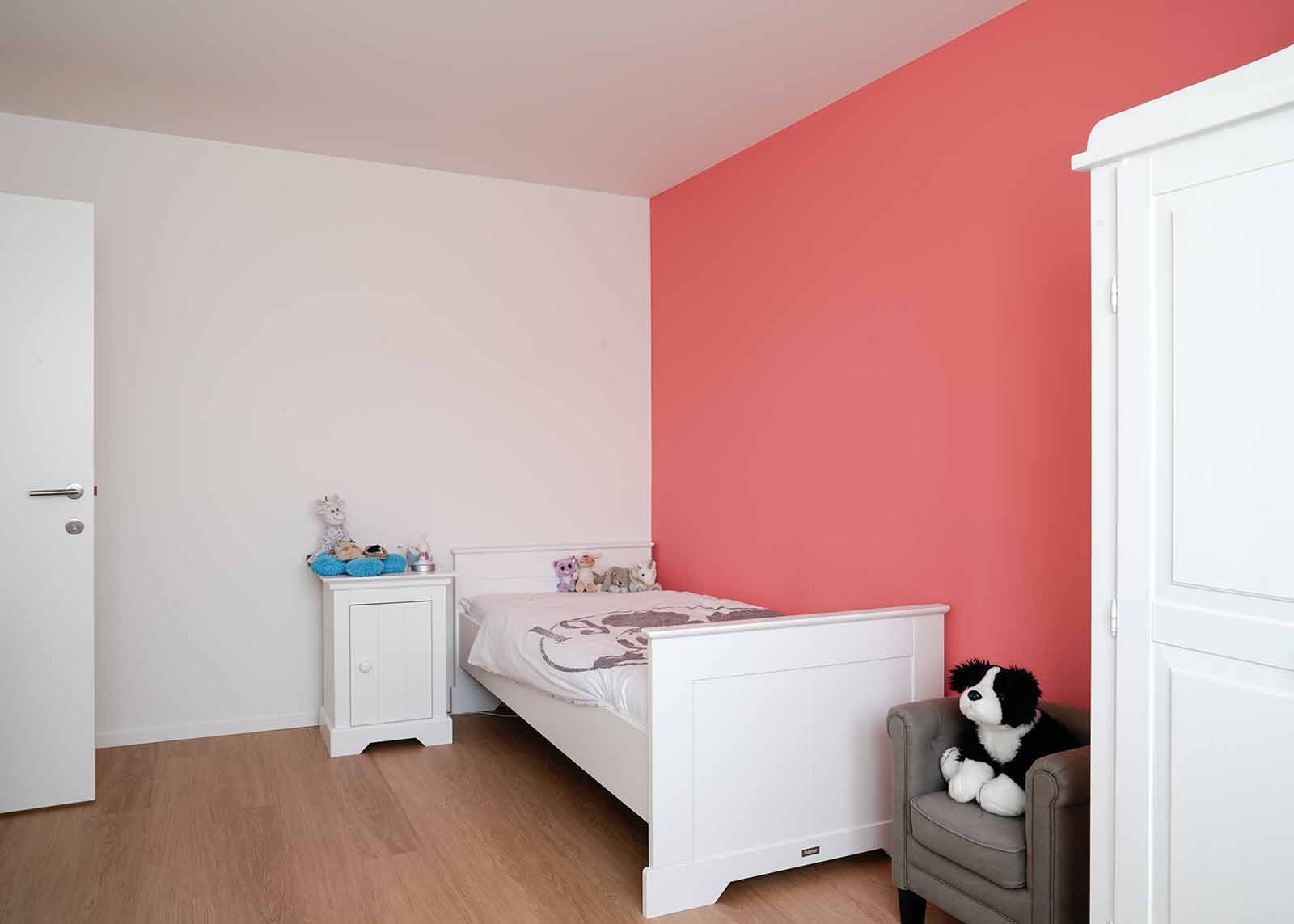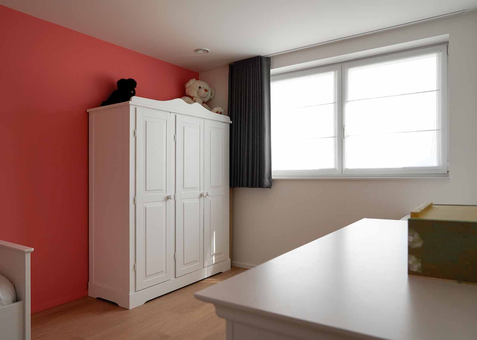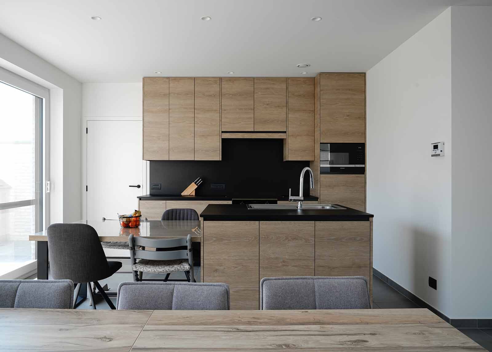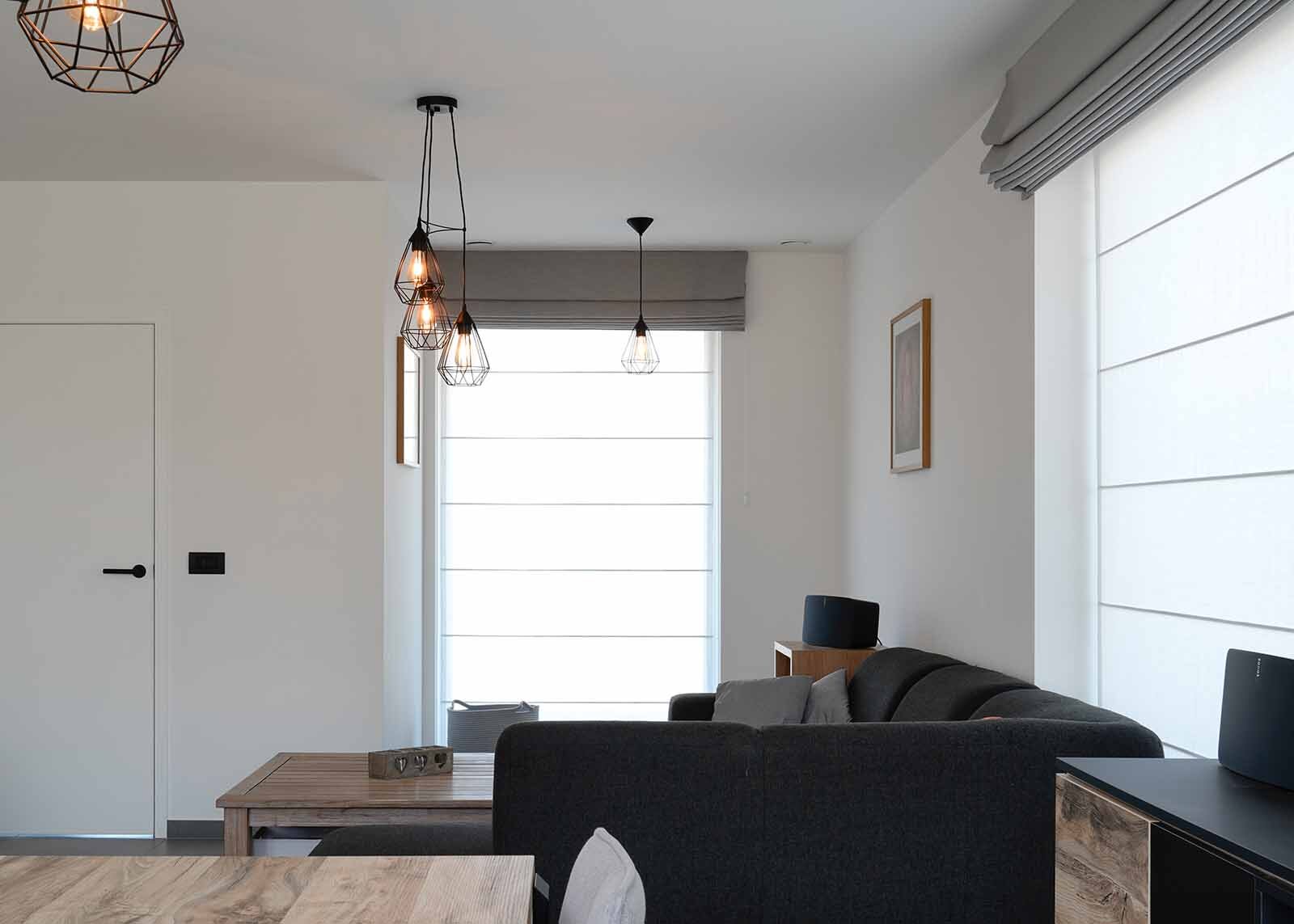 In deze moderne woning contrasteren de bleke gevelstenen knap met de zwarte houten accenten aan de poort en voordeur. Grote ramen garanderen een optimale lichtinval doorheen het hele huis. In de woning koos de familie S.-R. voor grijze vloertegels op het gelijkvloers, in de toiletten en in de badkamer. De vloer op het eerste verdiep is bekleed met laminaat. De open leefruimte met aanpalende keuken creëert een groot ruimtegevoel op de benedenverdieping. Met een oostelijk georiënteerde tuin geniet de familie het hele jaar door van een aangenaam binnenklimaat.