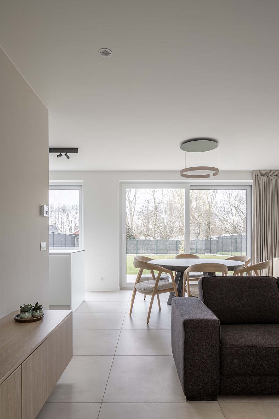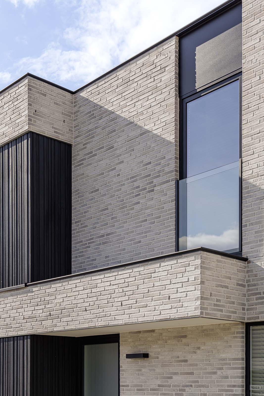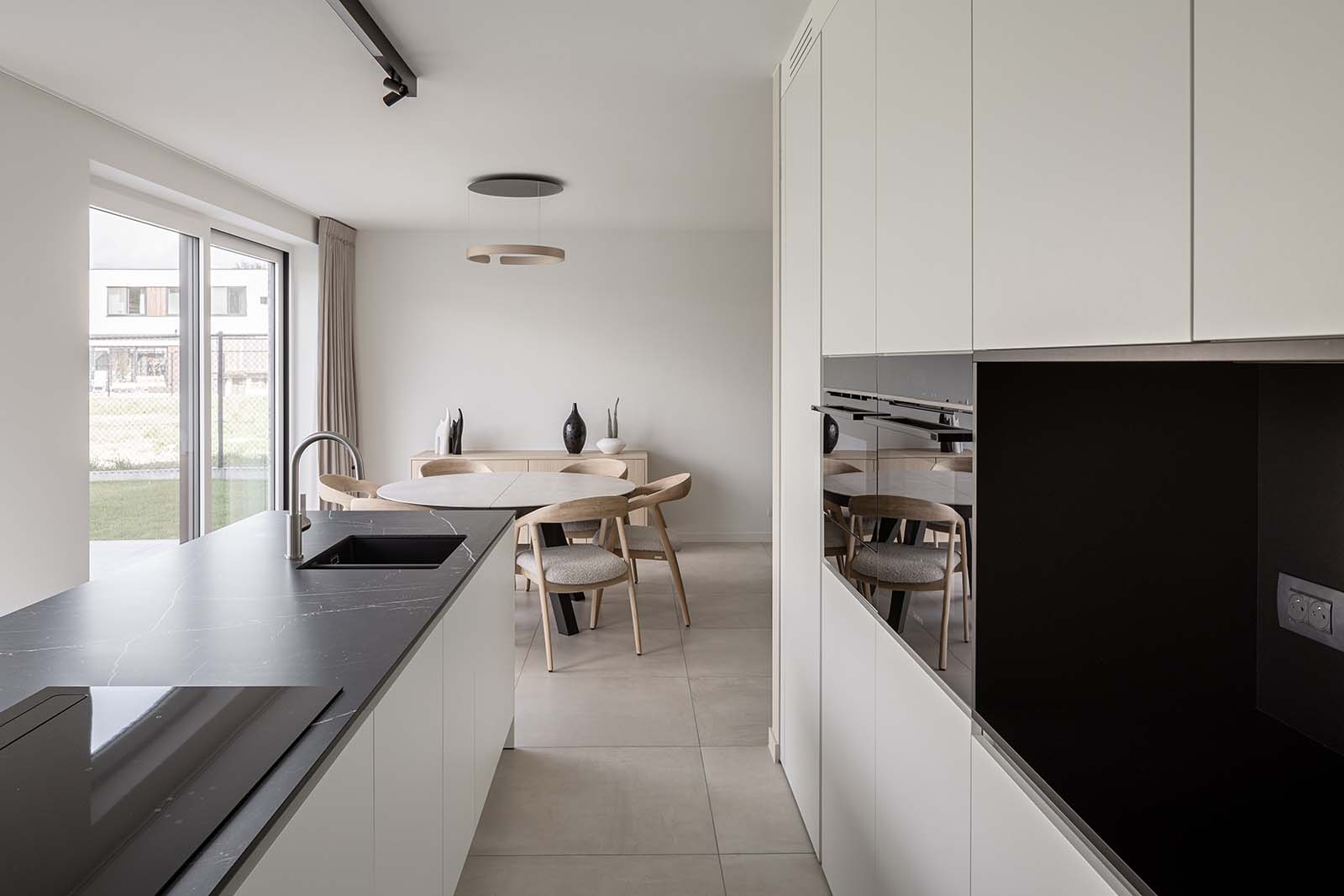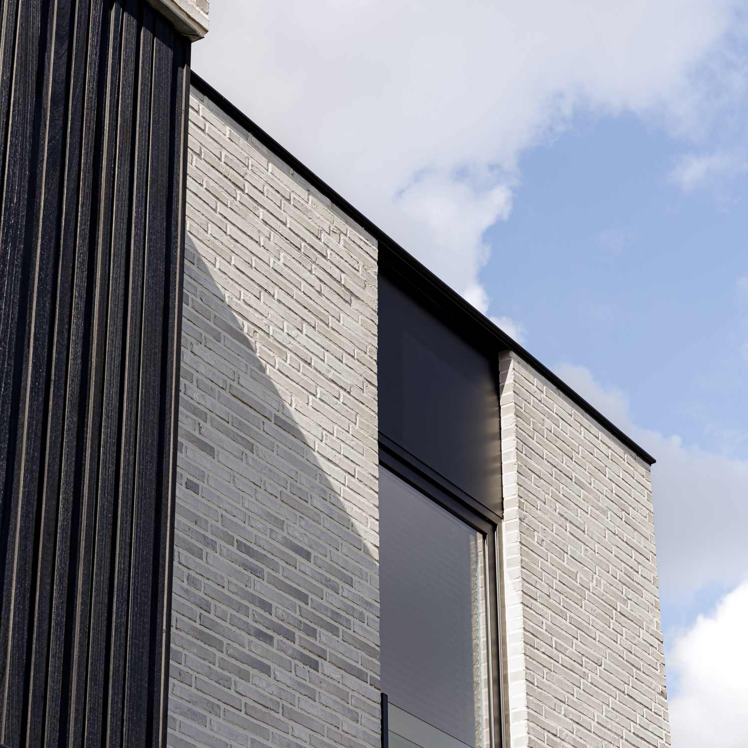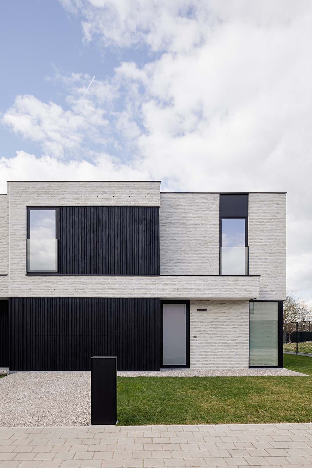 Aan de straatkant staan de smalle, lange raampartijen van deze moderne halfopen projectwoning garant voor maximale privacy. De zwarte houten gevelbekleding tekent knap af tegen de grijswitte gevelstenen. Binnenin is de leefruimte volledig naar het zuiden gericht. In de open keuken en eetruimte hebben de bewoners een maximaal zicht op de ruime tuin.
