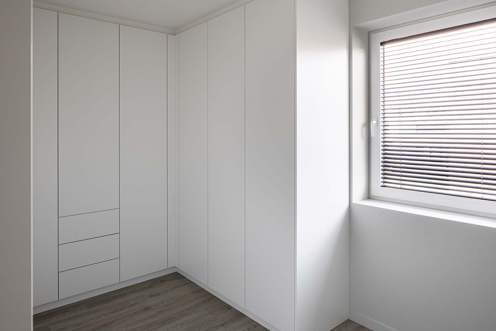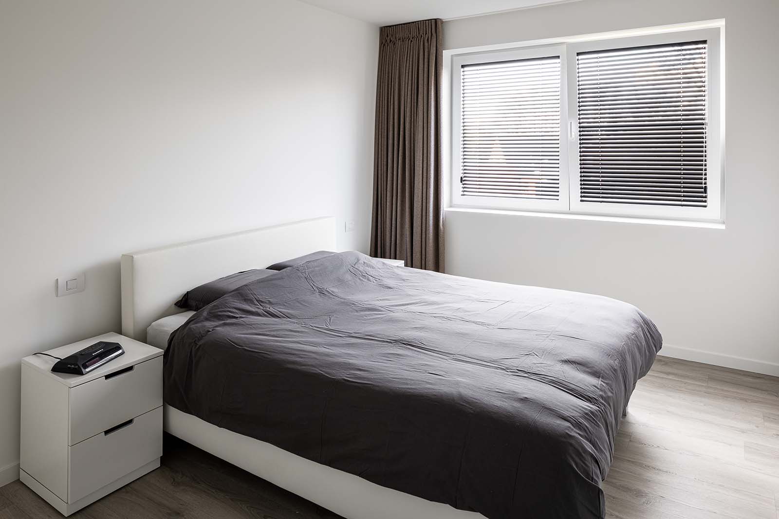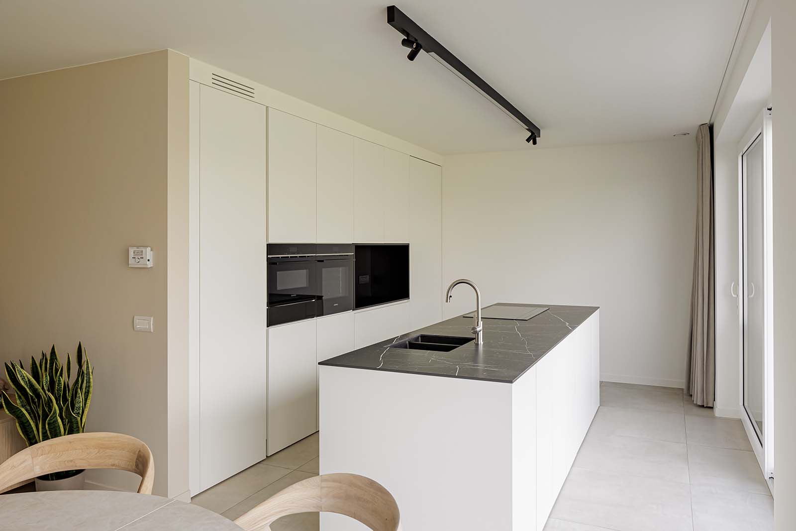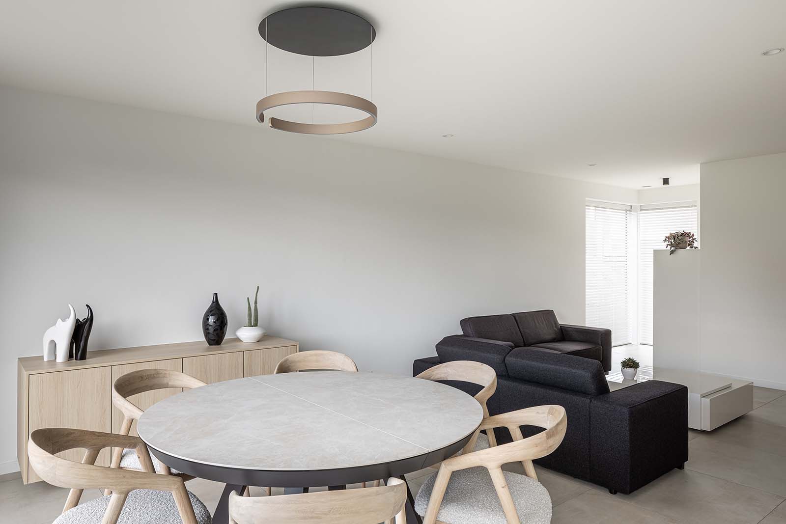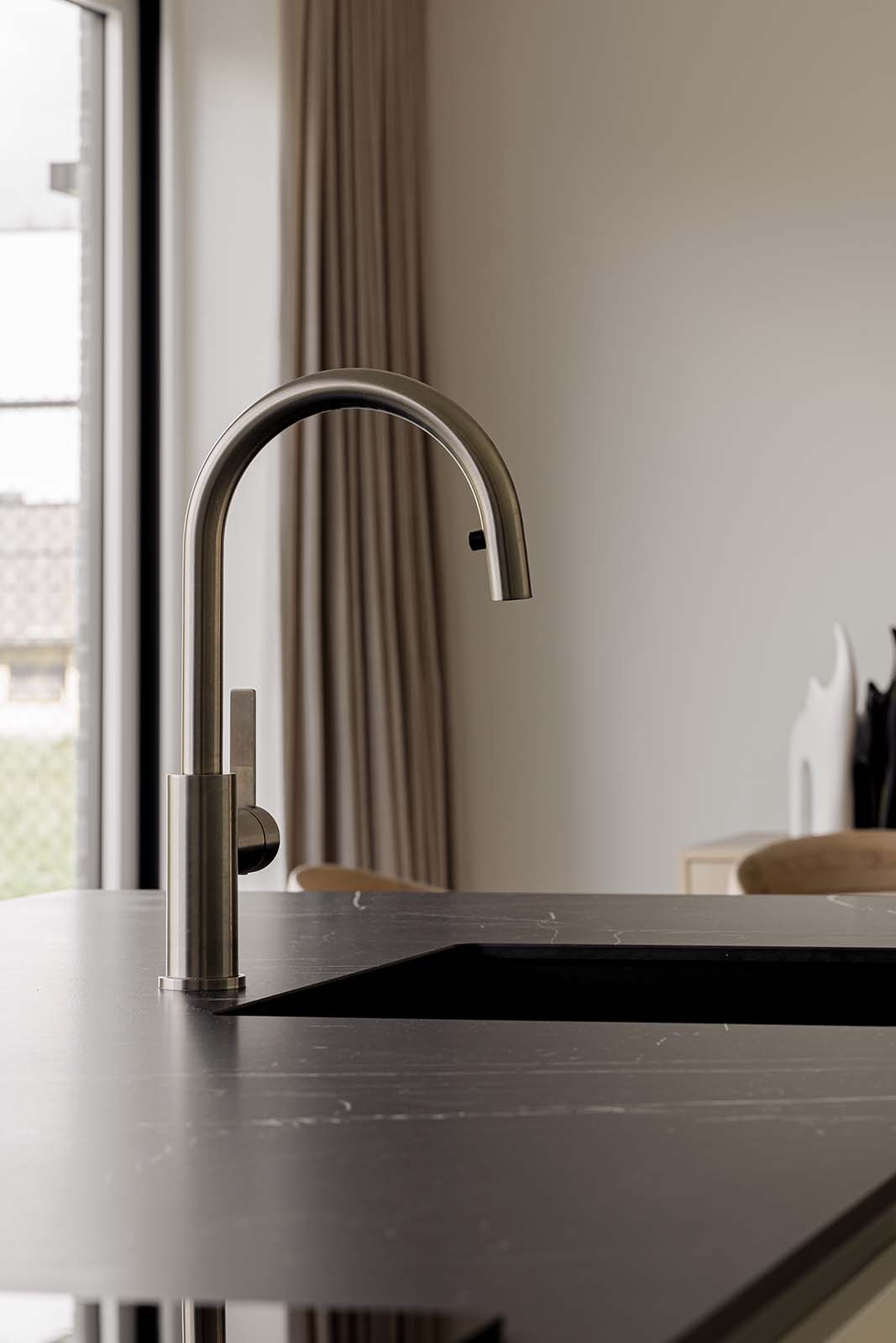 Aan de straatkant staan de smalle, lange raampartijen van deze moderne halfopen projectwoning garant voor maximale privacy. De zwarte houten gevelbekleding tekent knap af tegen de grijswitte gevelstenen. Binnenin is de leefruimte volledig naar het zuiden gericht. In de open keuken en eetruimte hebben de bewoners een maximaal zicht op de ruime tuin.
